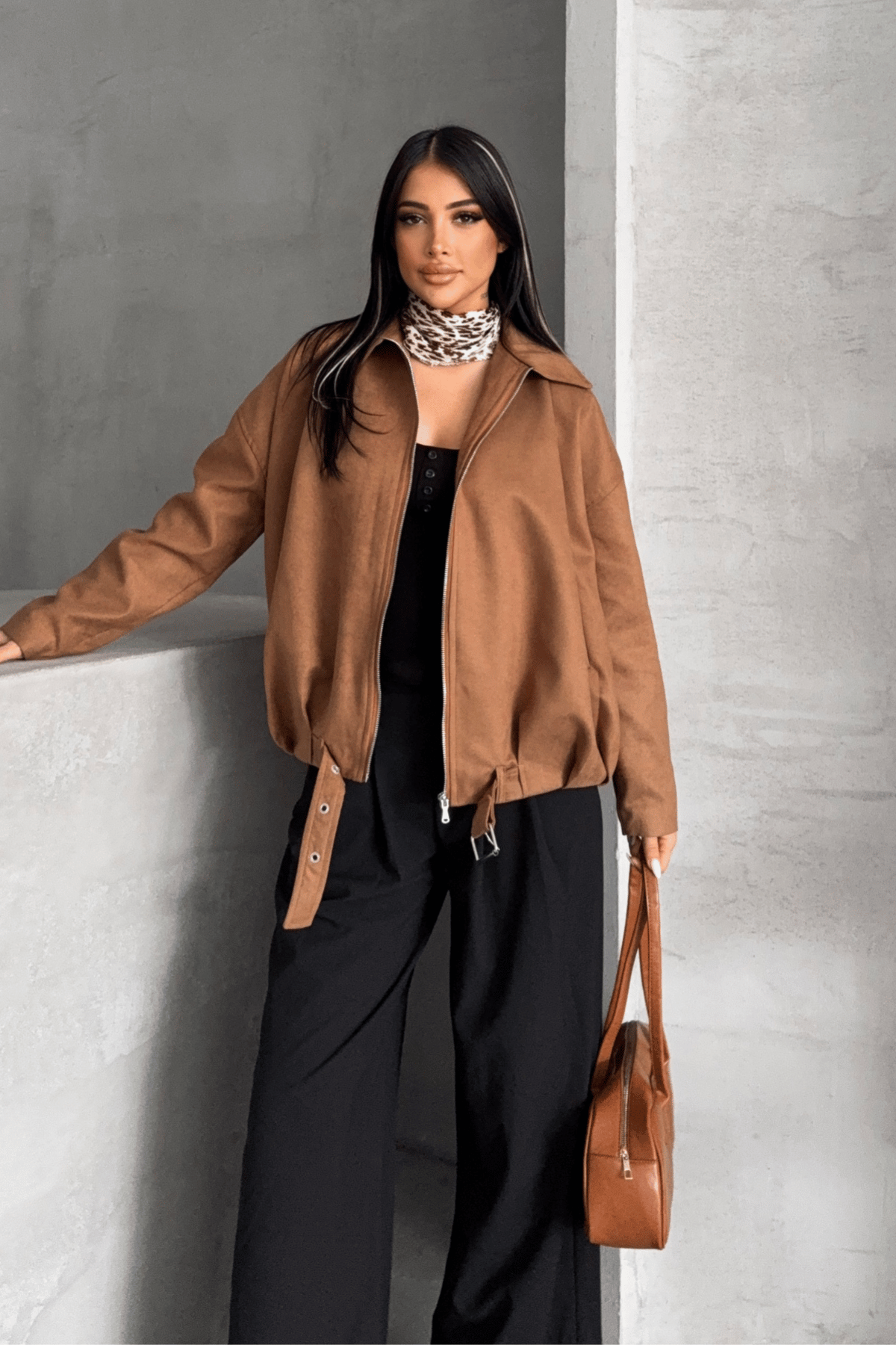 Dokuma Süet Kumaş Bomber Ceket - AÇIK KAHVE (GYM-2521-AÇIK KAHVE)