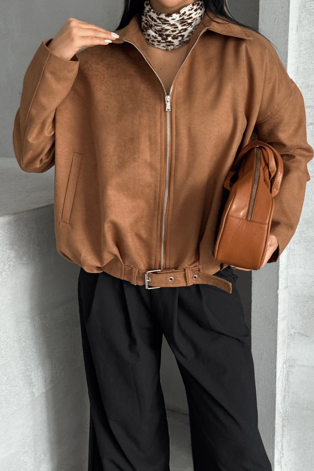 Dokuma Süet Kumaş Bomber Ceket - AÇIK KAHVE