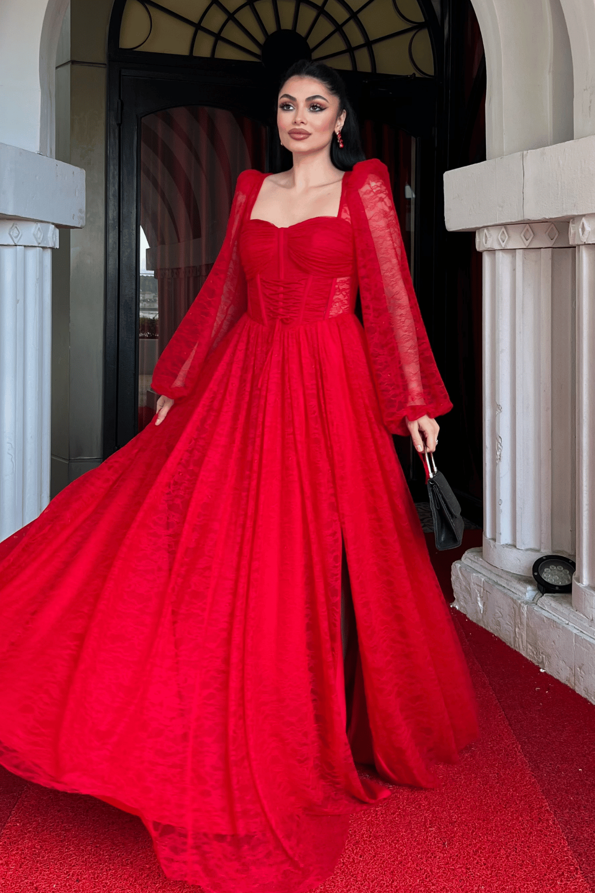 Dantel Kumaş Balen Detaylı Abiye Elbise - KIRMIZI