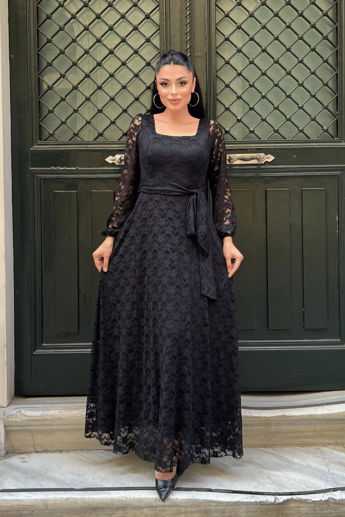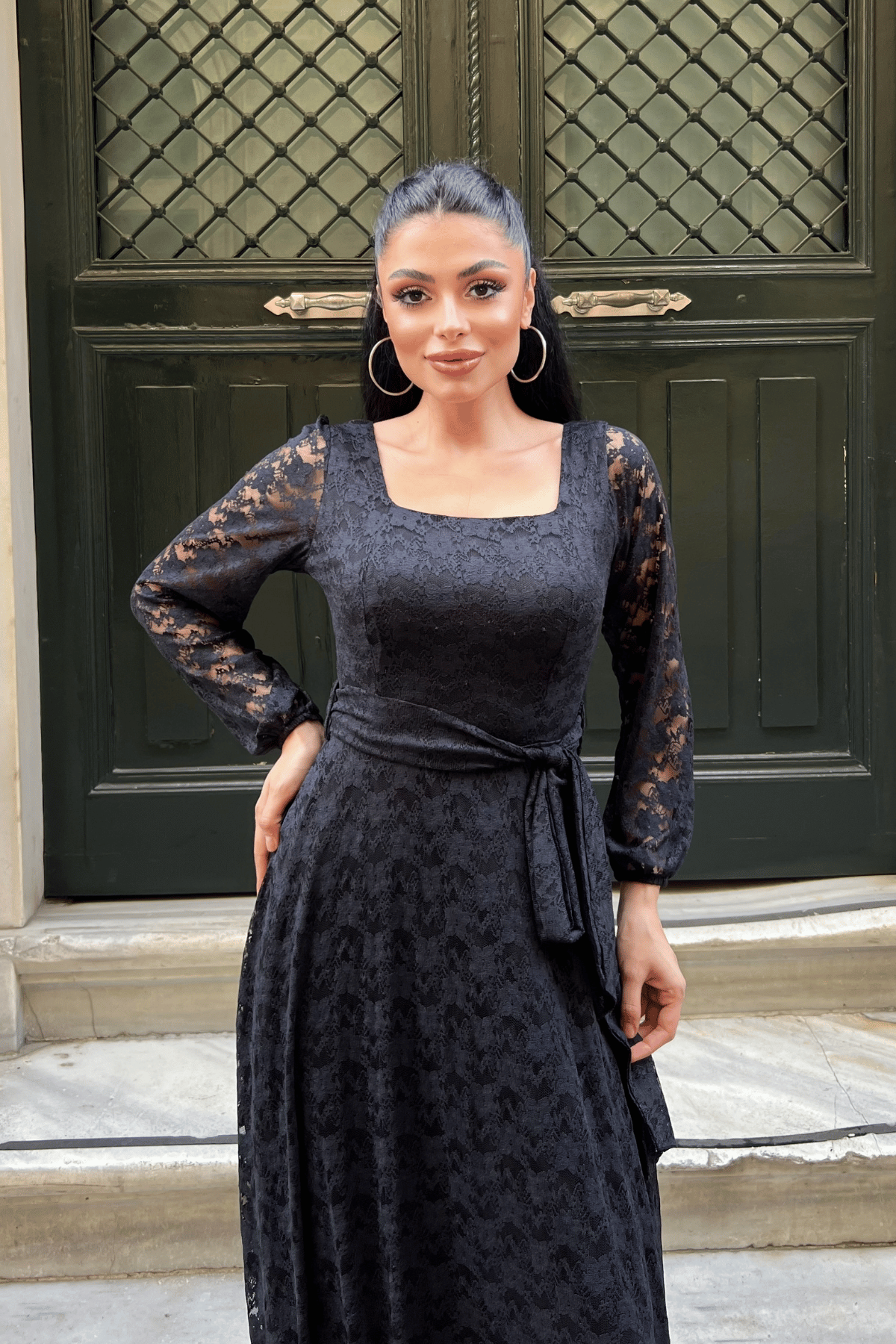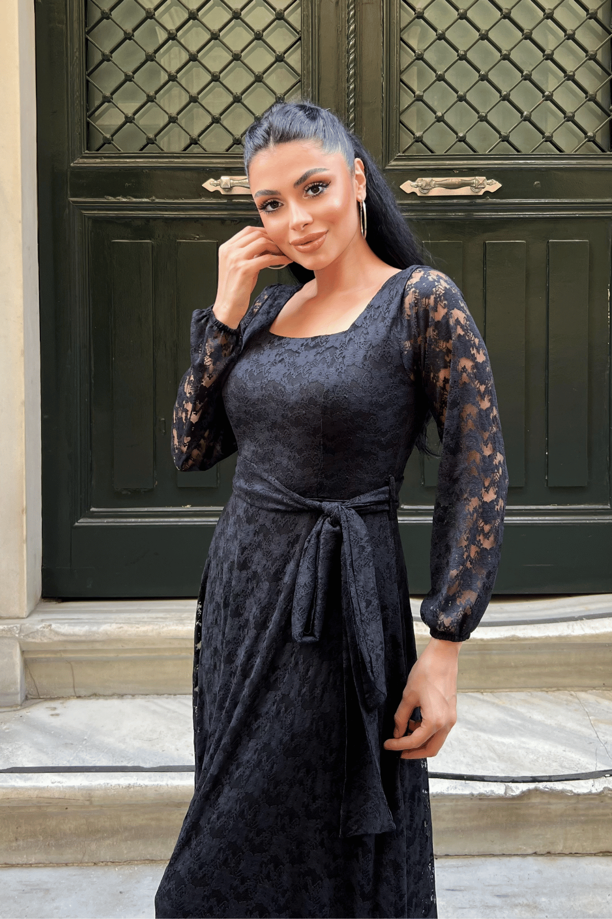 Dantel Kumaş Kare Yaka Elbise - SİYAH