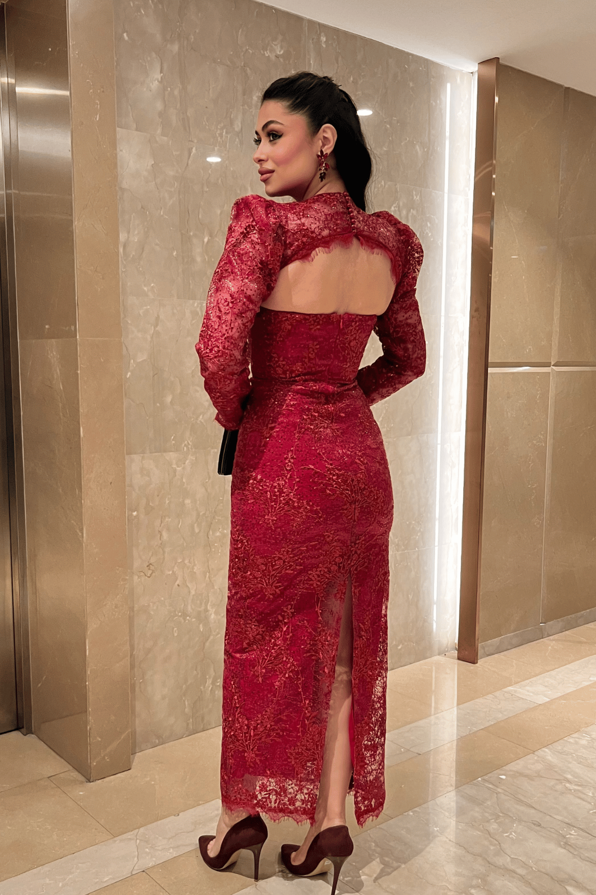 Dantelli Pullu Kumaş Sırt Detaylı Kalem Elbise - KIRMIZI