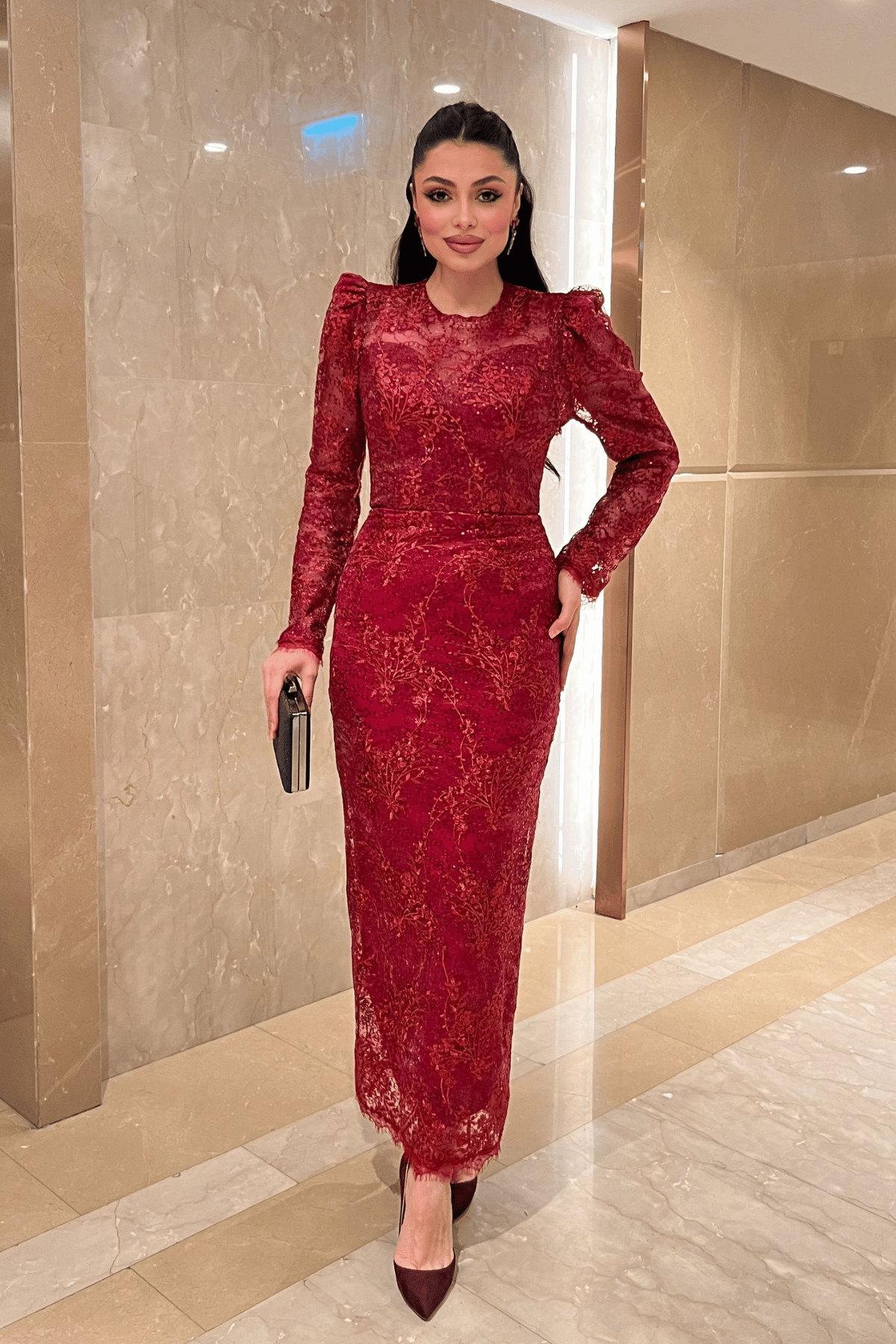 Dantelli Pullu Kumaş Sırt Detaylı Kalem Elbise - KIRMIZI (GYM-2012-KIRMIZI)