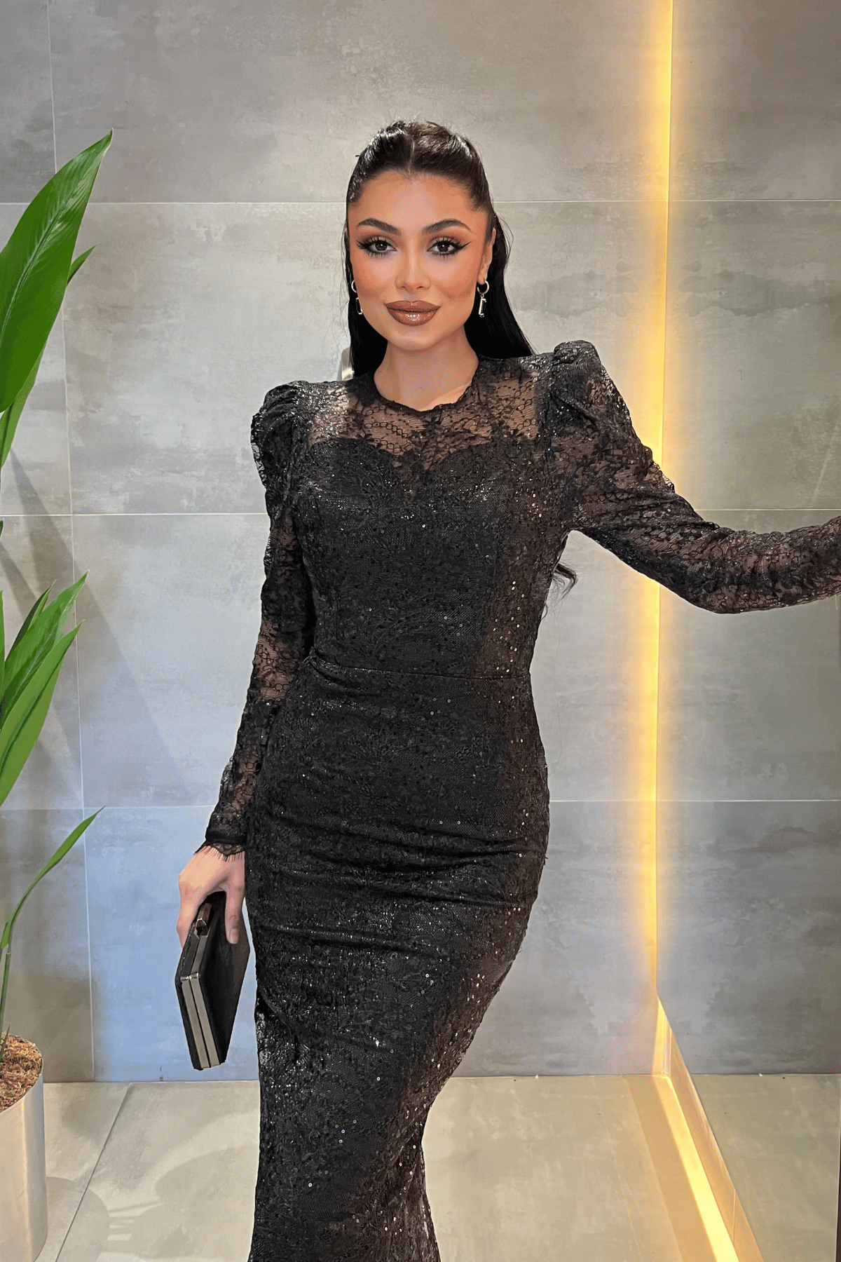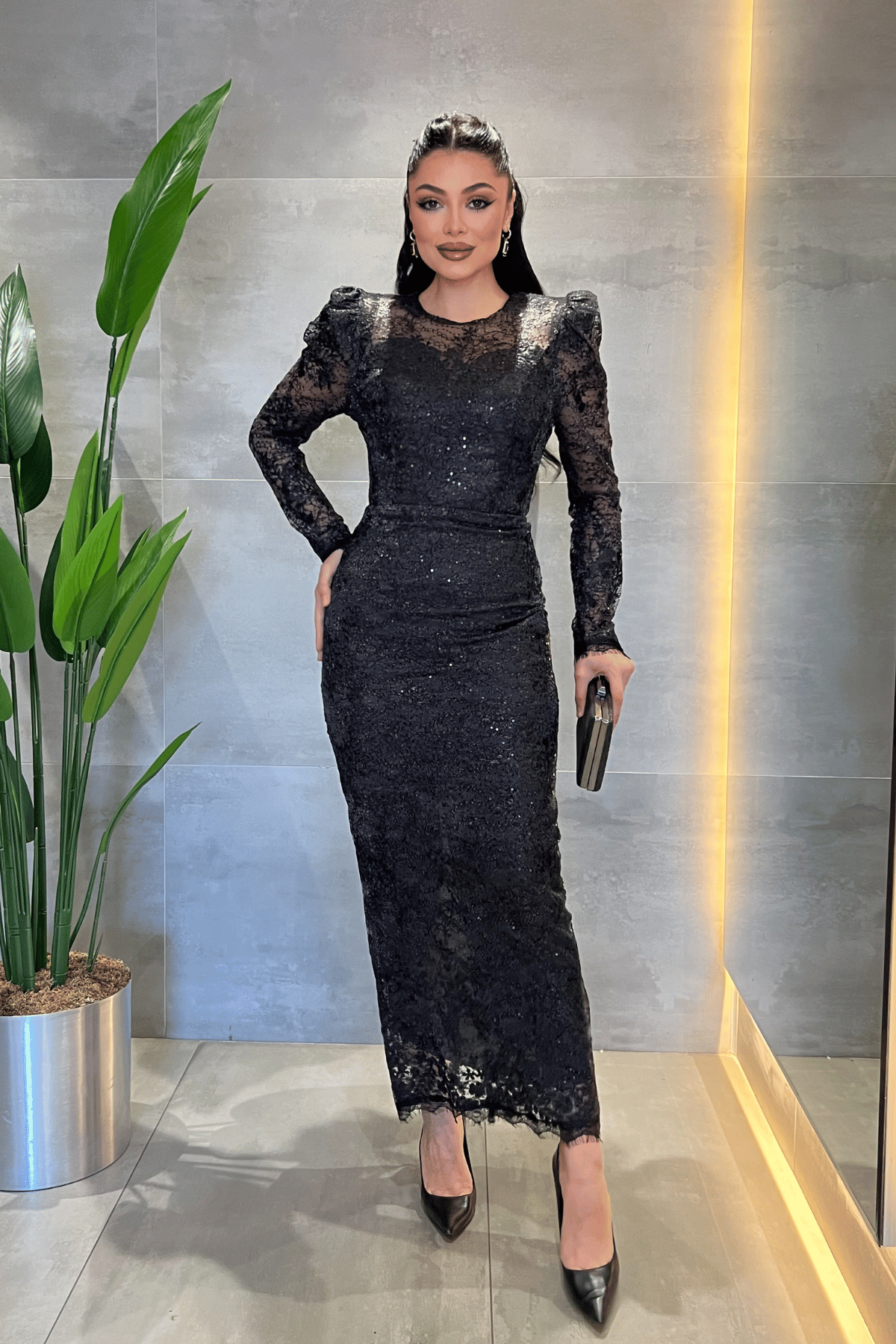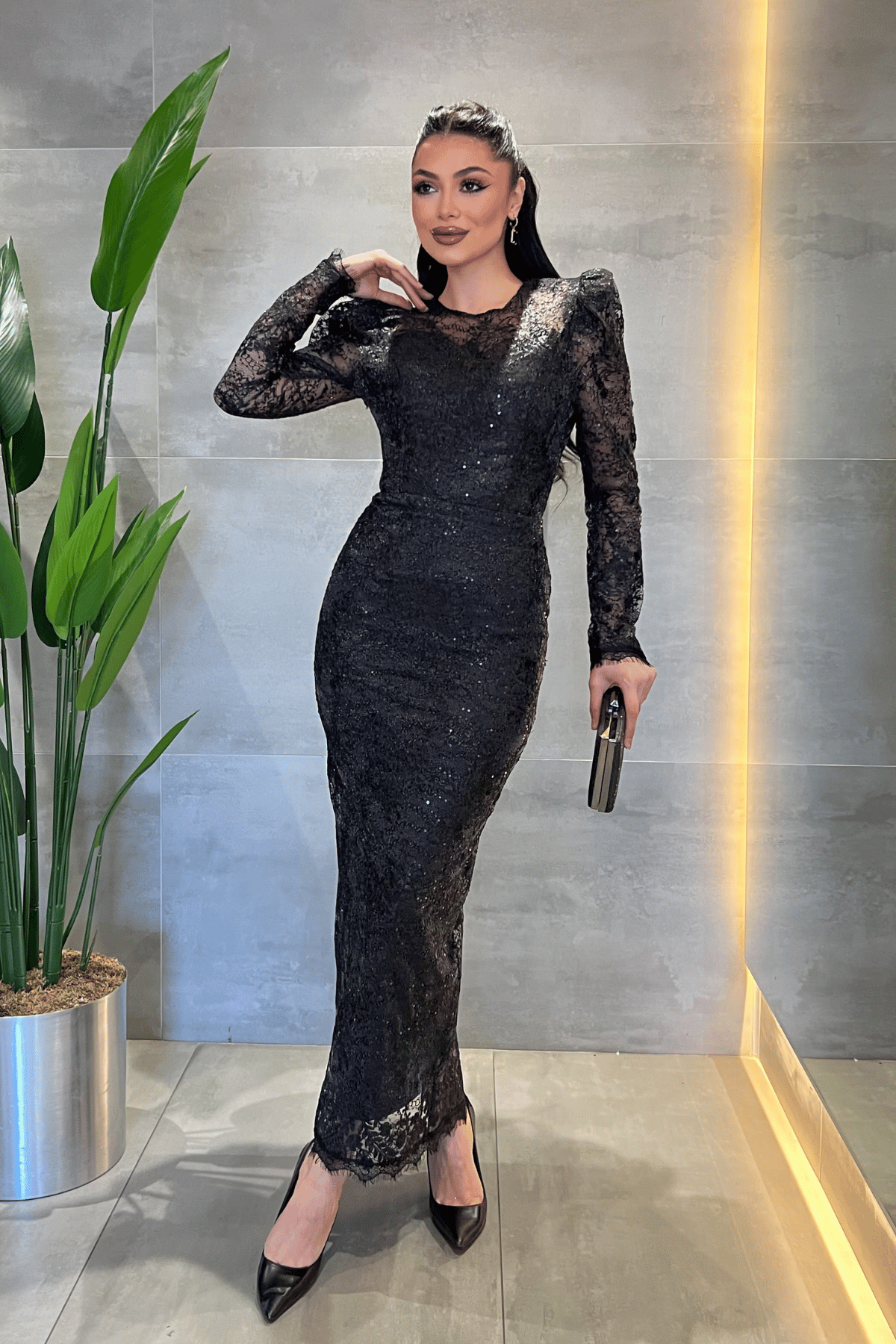 Dantelli Pullu Kumaş Sırt Detaylı Kalem Elbise - SİYAH (GYM-2012-SİYAH)