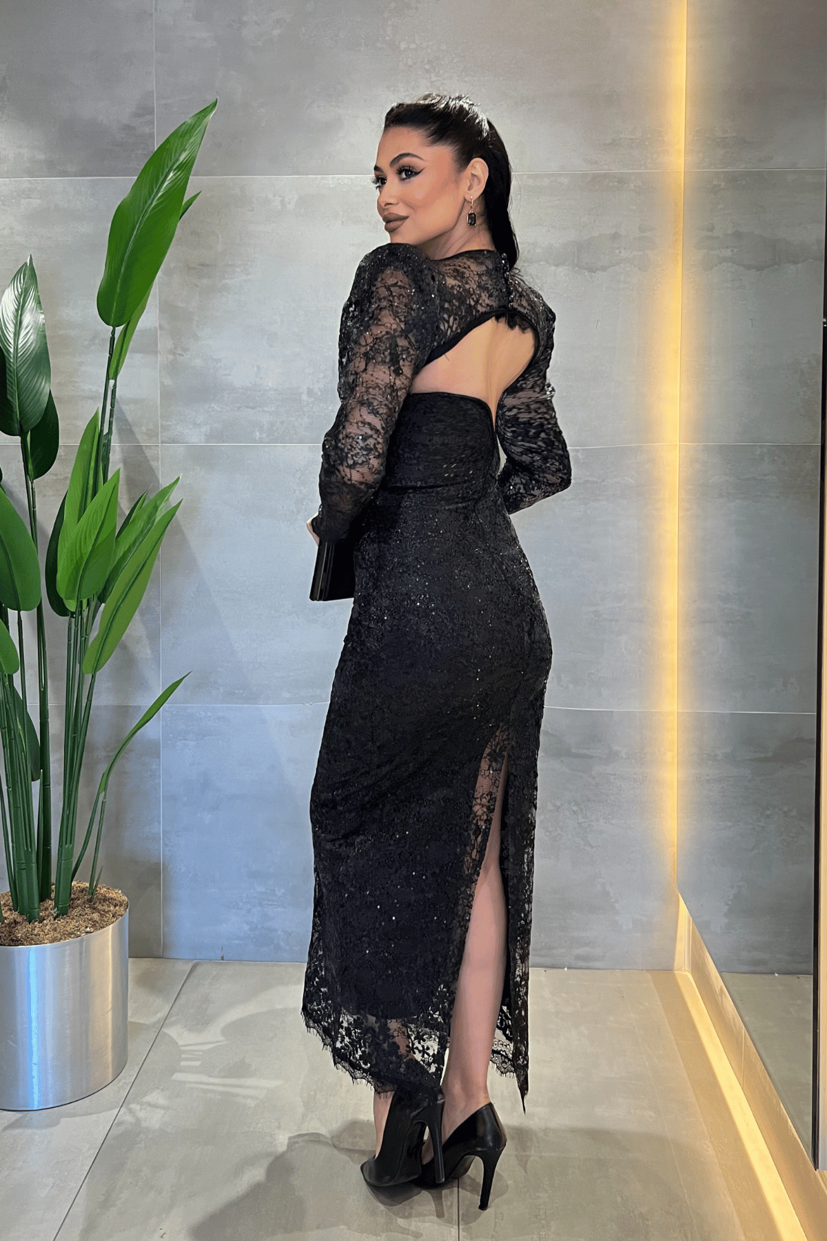 Dantelli Pullu Kumaş Sırt Detaylı Kalem Elbise - SİYAH