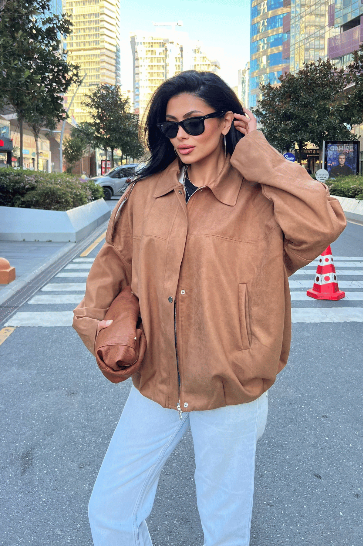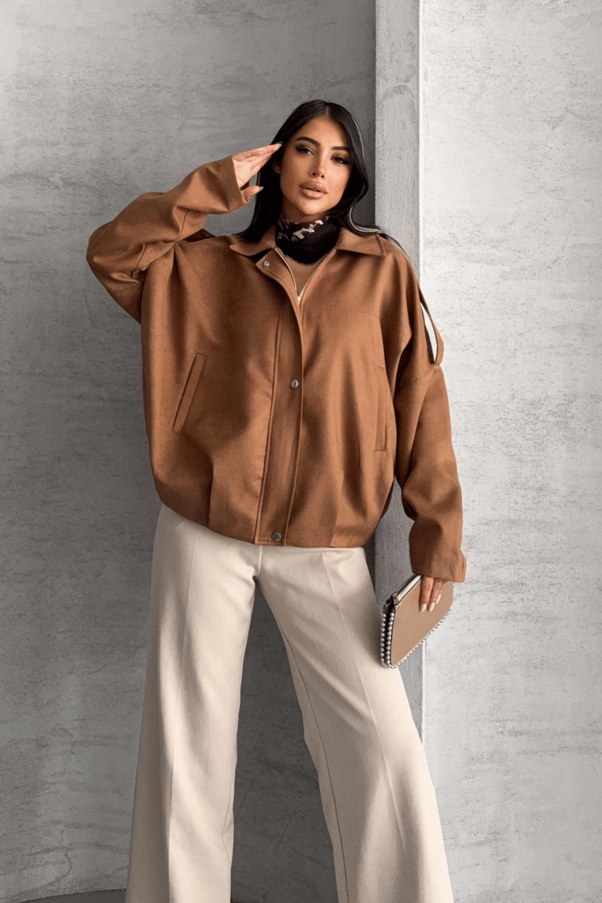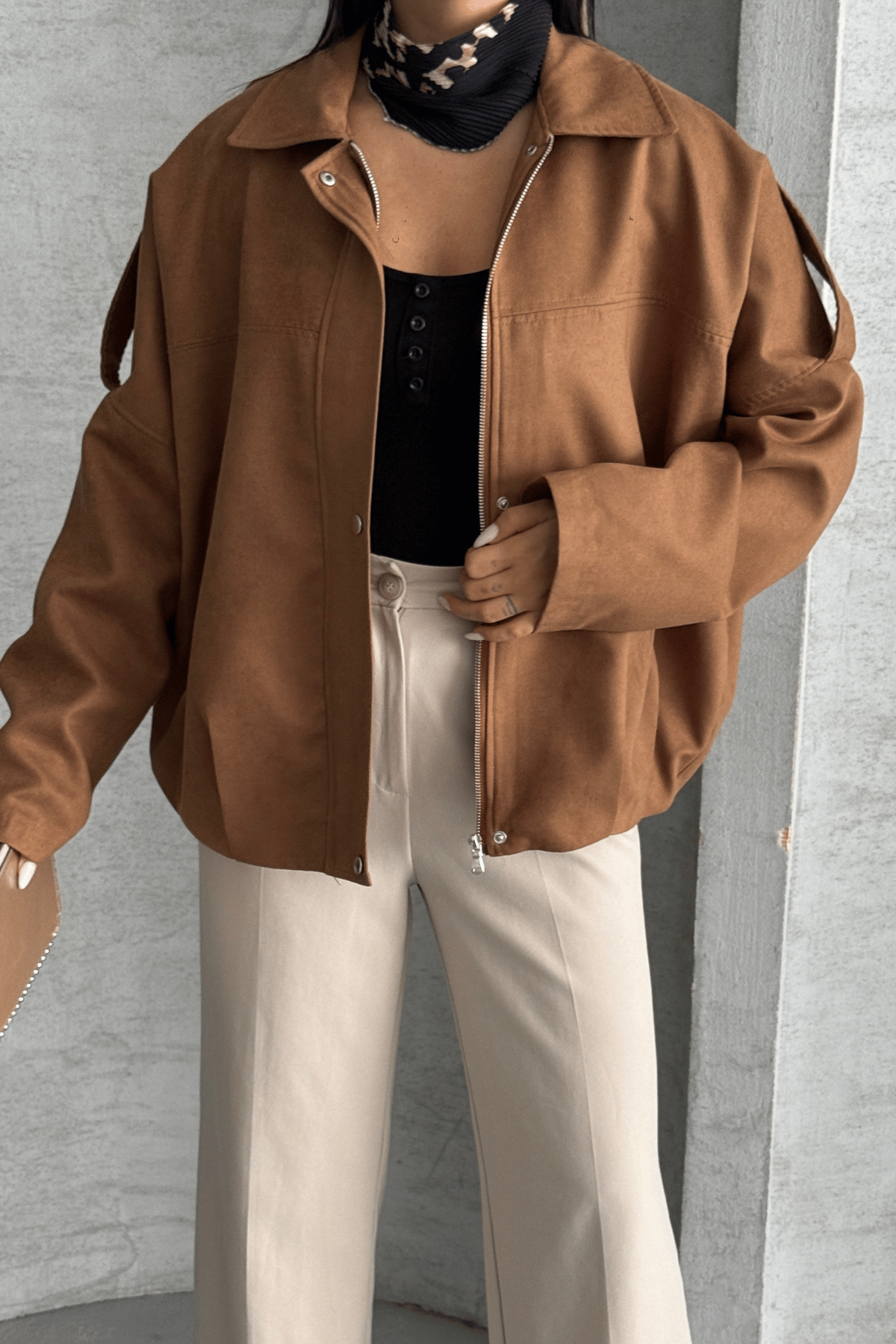 Dokuma Süet Kumaş Apoletli Bomber Ceket - AÇIK KAHVE (GYM-2522-AÇIK KAHVE)