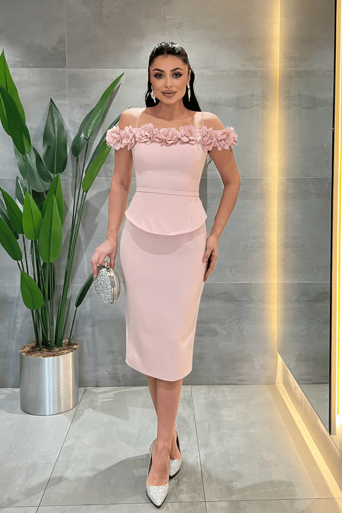 Double Kumaş Çiçek Detaylı Kalem Elbise - PUDRA (GYM-180-PUDRA)