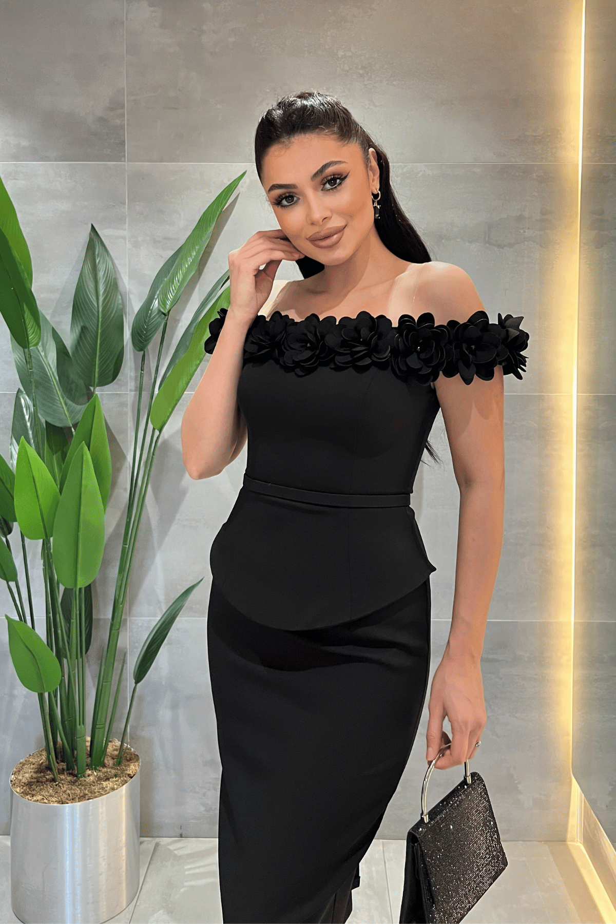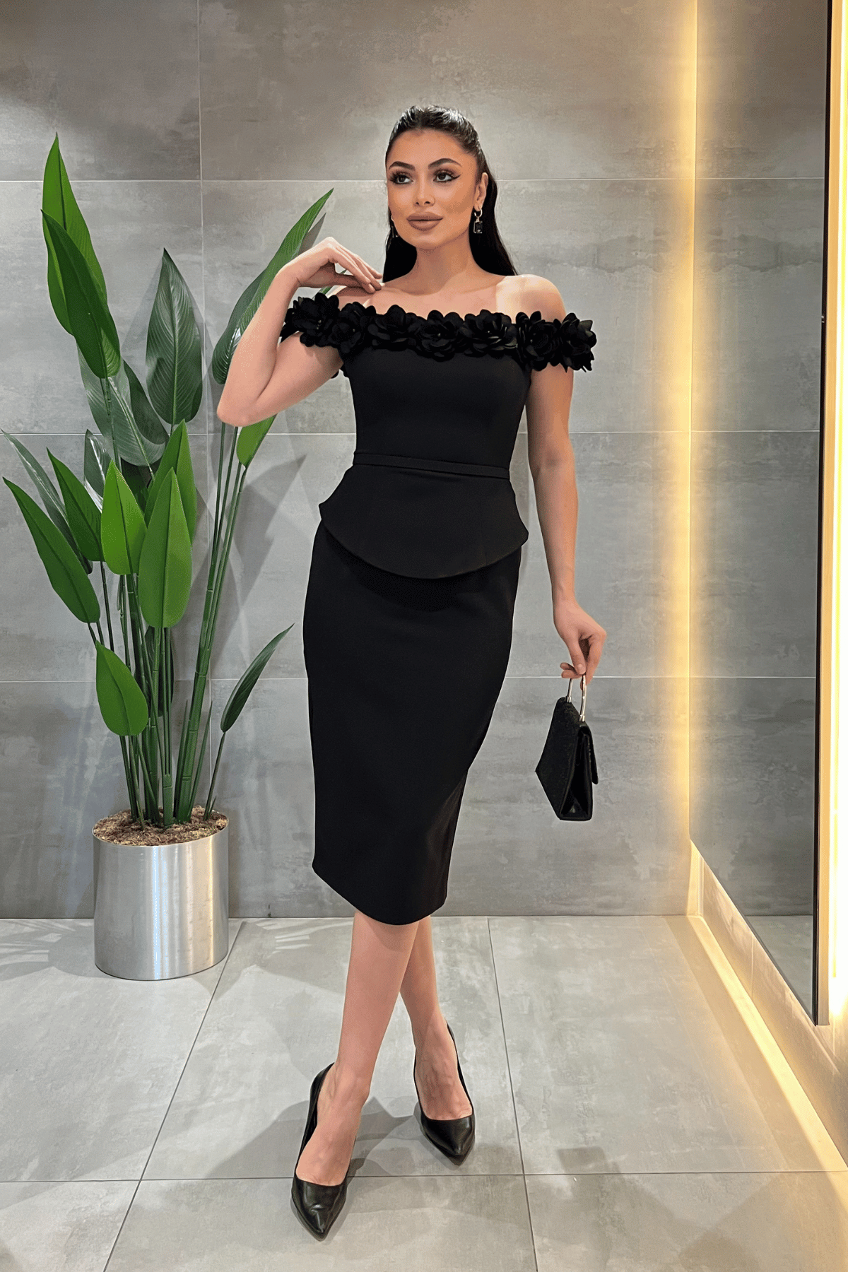 Double Kumaş Çiçek Detaylı Kalem Elbise - SİYAH (GYM-180-SİYAH)