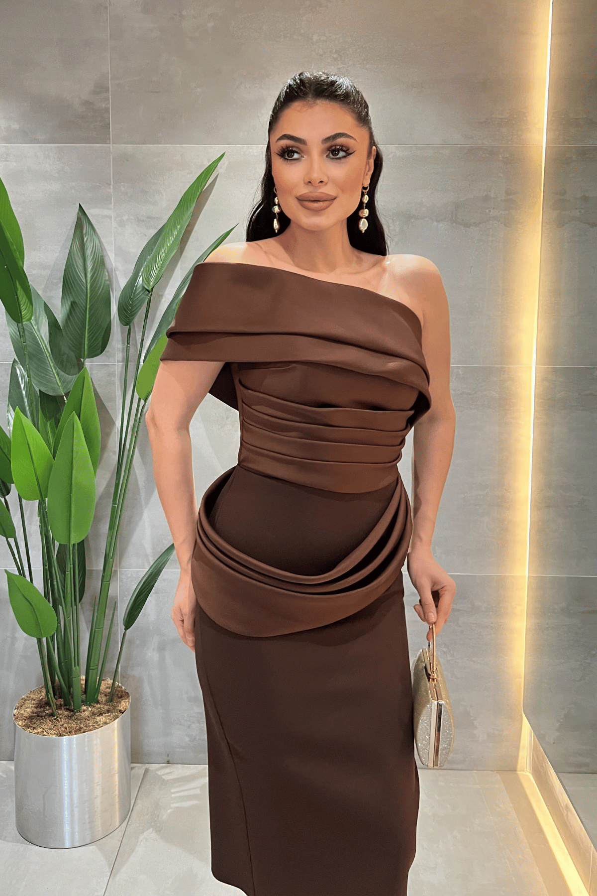 Double Kumaş Tek Kol Kalem Elbise - KAHVERENGİ (GYM-176-KAHVERENGİ)
