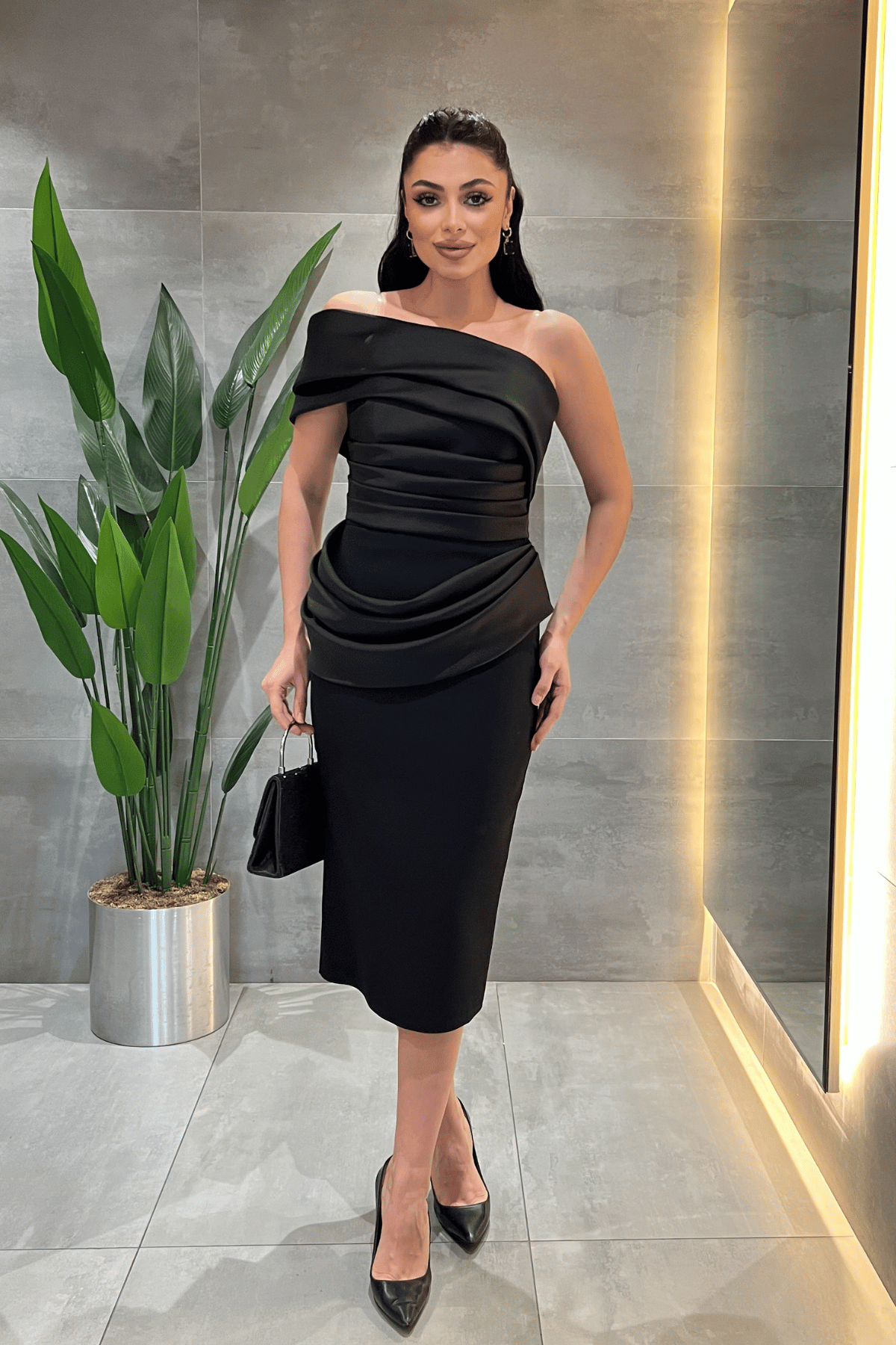 Double Kumaş Tek Kol Kalem Elbise - SİYAH