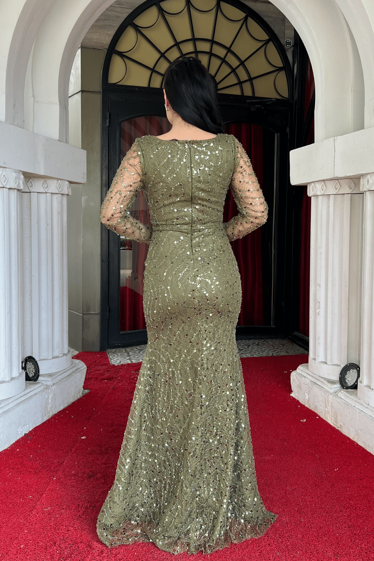 Full Boncuklu Kumaş Degaje Yaka Balık Elbise - HAKİ YEŞİLİ