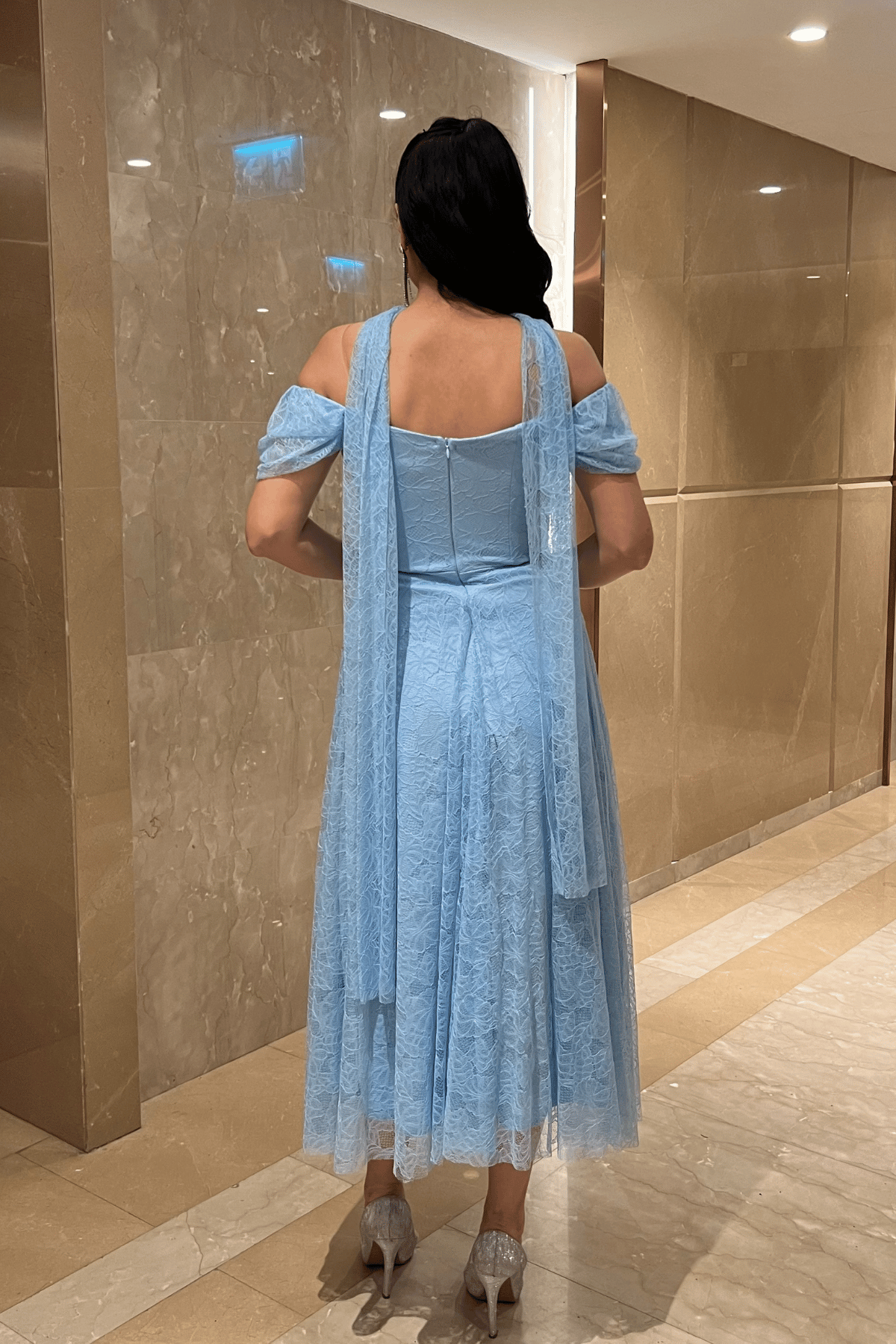 Full Dantel Kumaş Şal Detaylı Midi Elbise - BEBE MAVİSİ