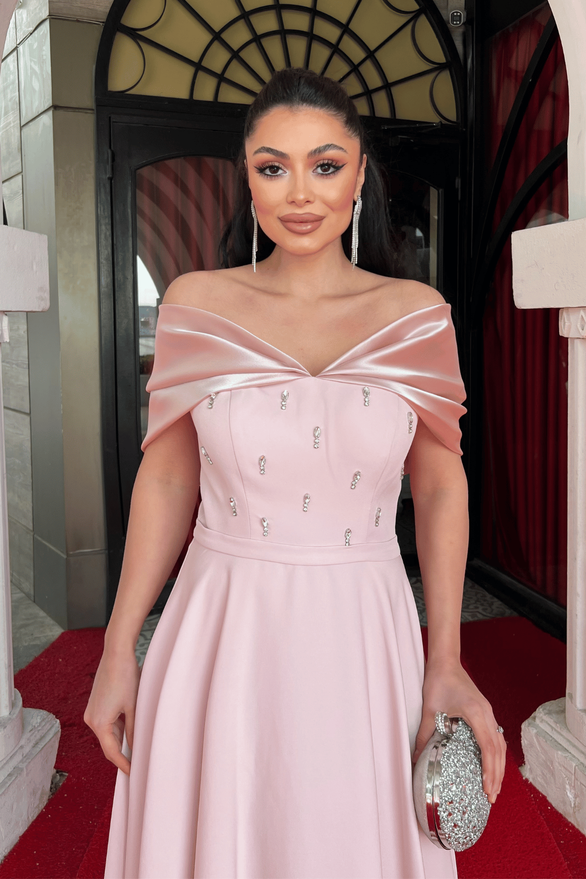 Krep Kumaş Taş Detaylı Midi Elbise - PUDRA (GYM-559-PUDRA)