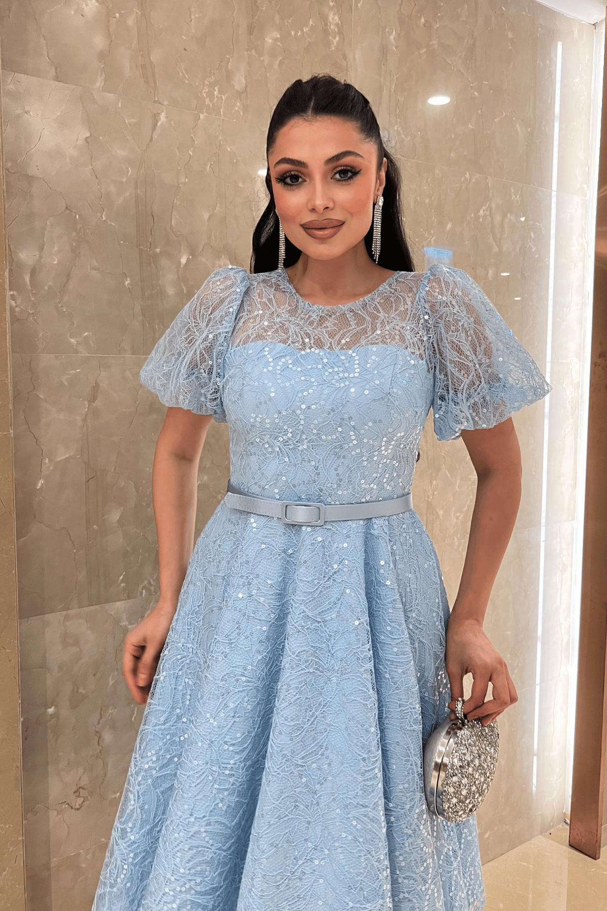 Pul Payet Kumaş Balon Kol Midi Elbise - BEBE MAVİSİ (GYM-167-BEBE MAVİSİ)