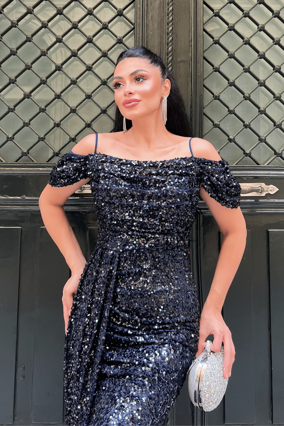 Pul Payet Kumaş Degaje Yaka Abiye Elbise - LACİVERT (GYM-41066-LACİVERT)