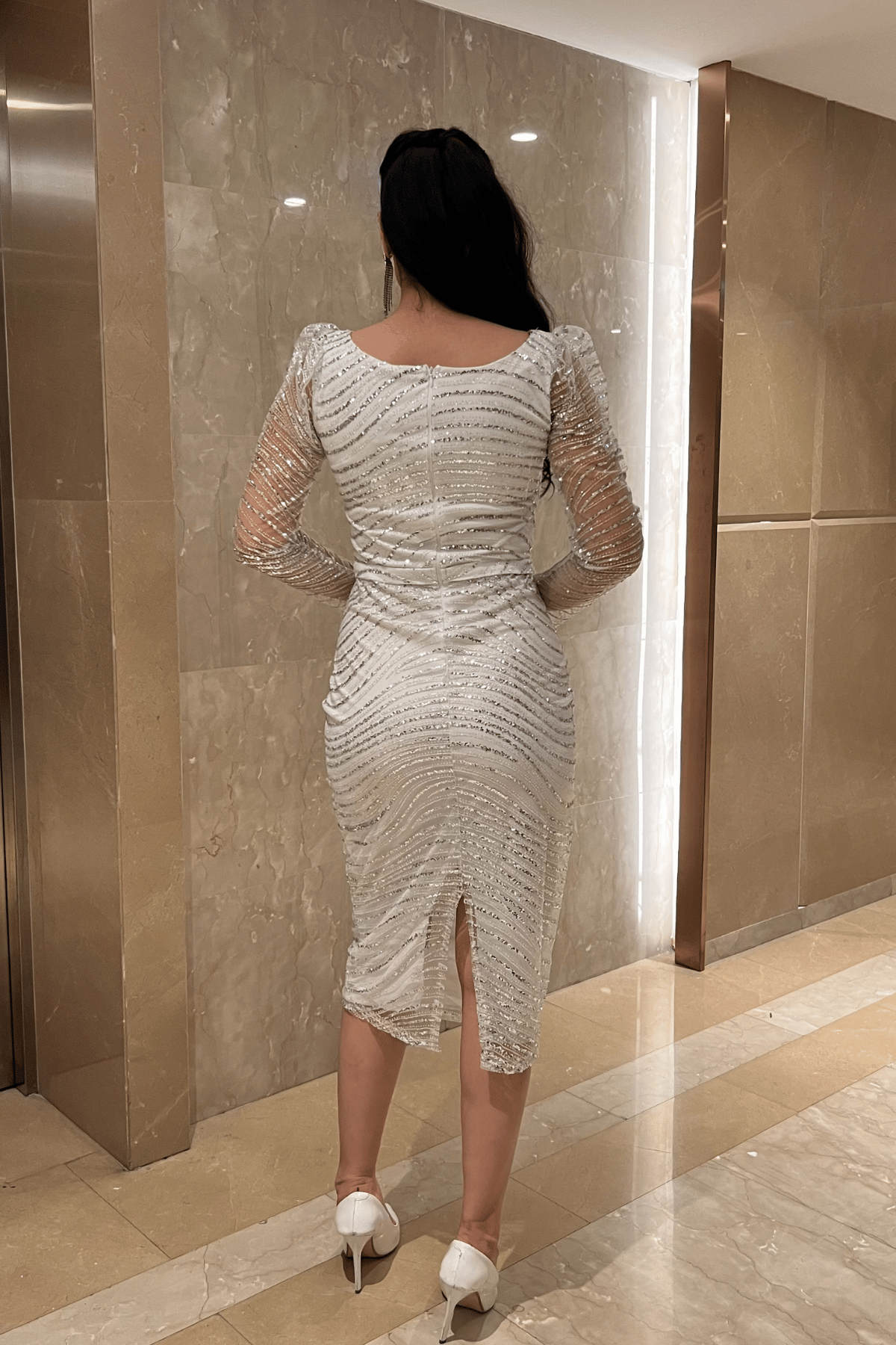 Pullu Payet Kumaş Kare Yaka Kalem Elbise - BEYAZ (GYM-39852-BEYAZ)