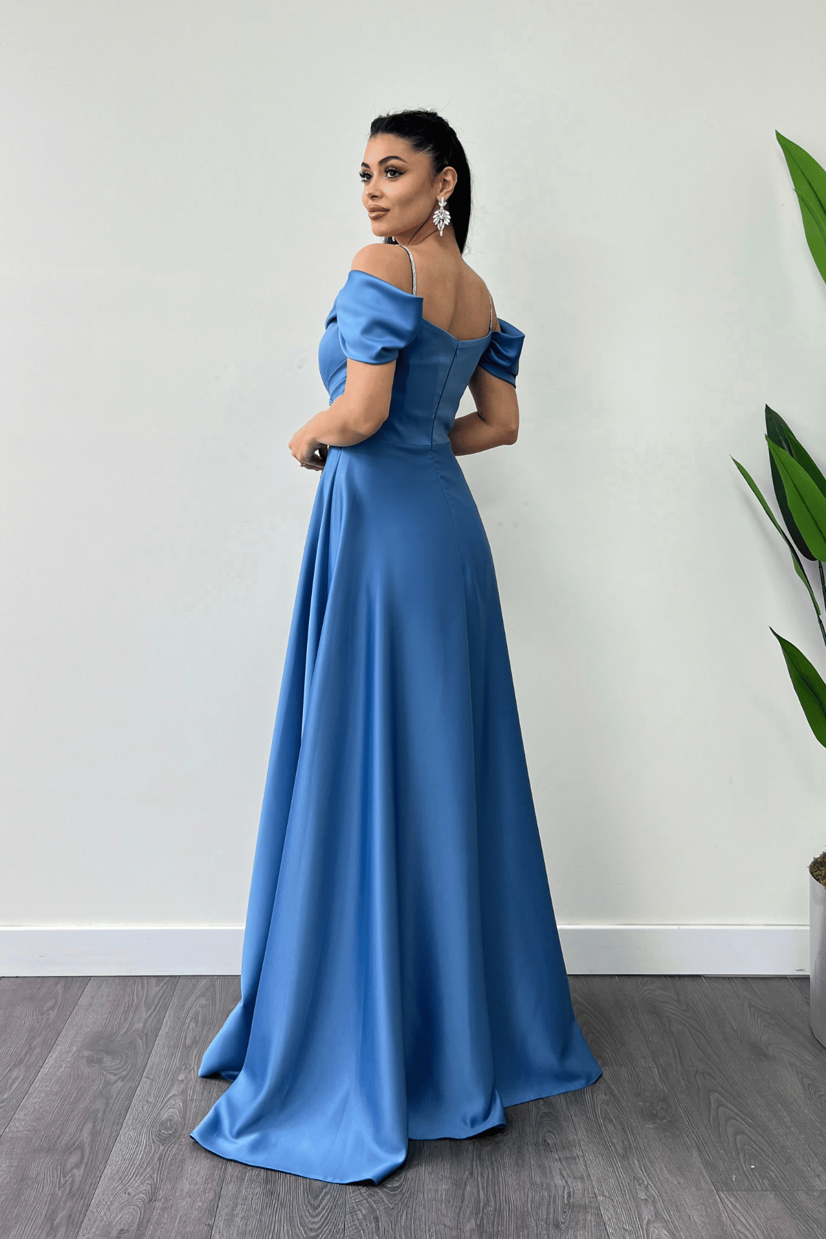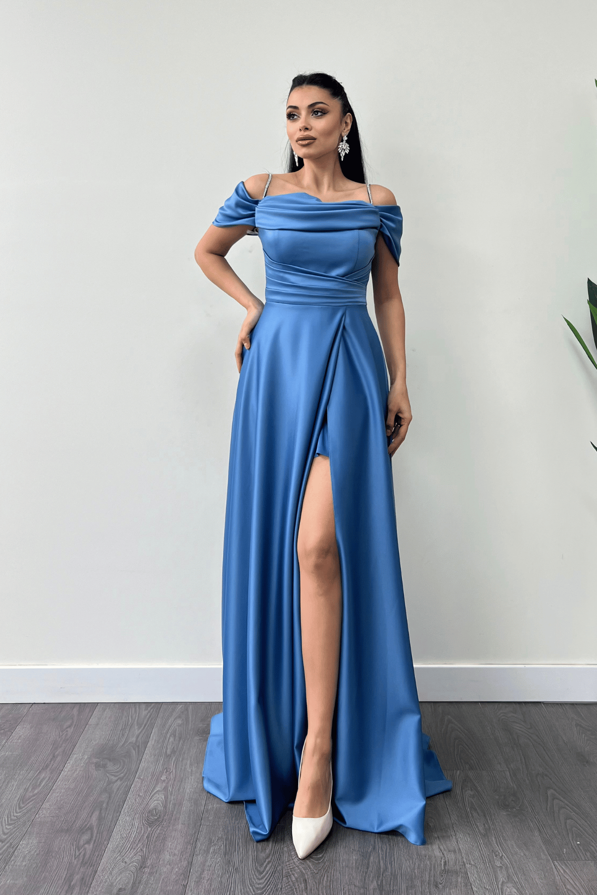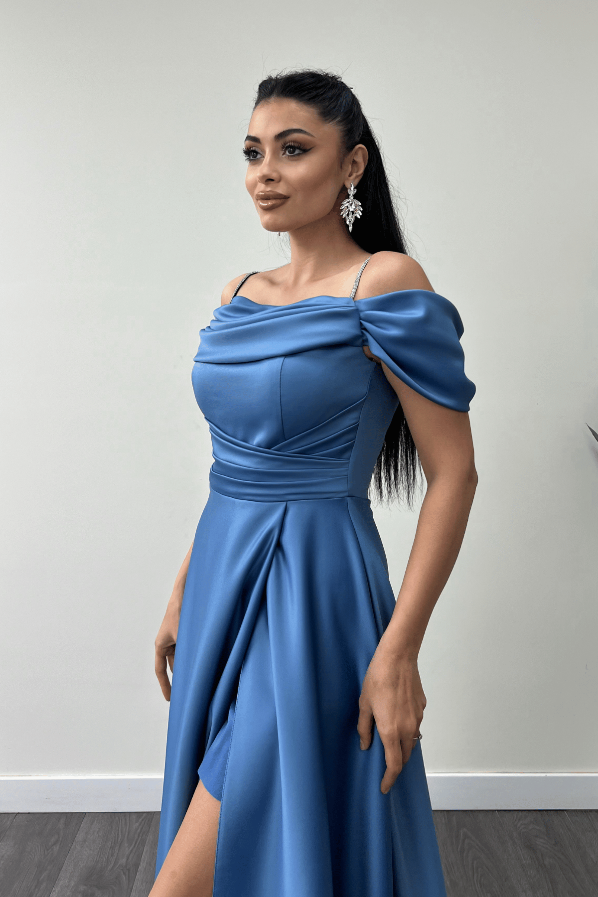 Saten Kumaş Büzgülü Askılı Abiye Elbise - İNDİGO MAVİ (GYM-1440-İNDİGO MAVİ)
