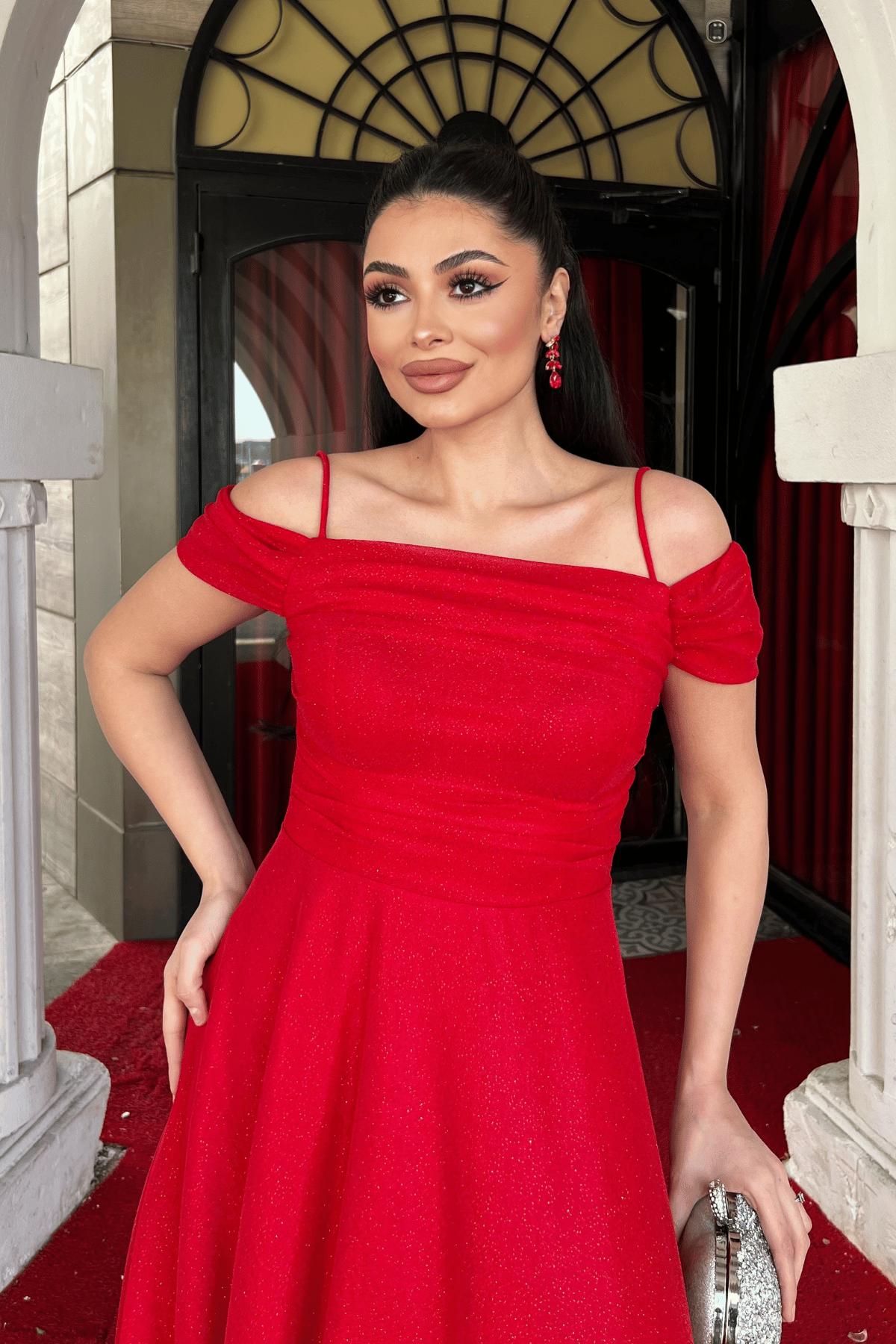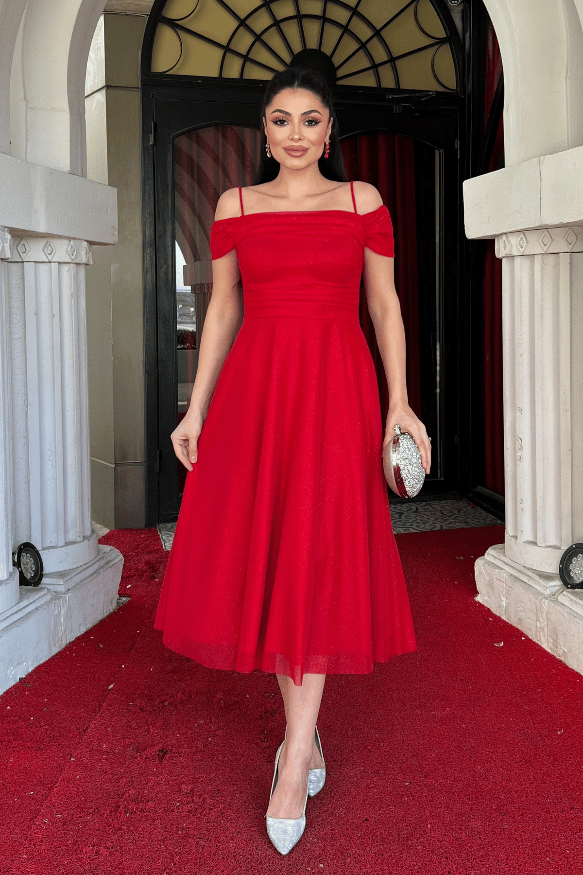 Simli Tül Kumaş Midi Boy Elbise - KIRMIZI (GYM-39976-KIRMIZI)