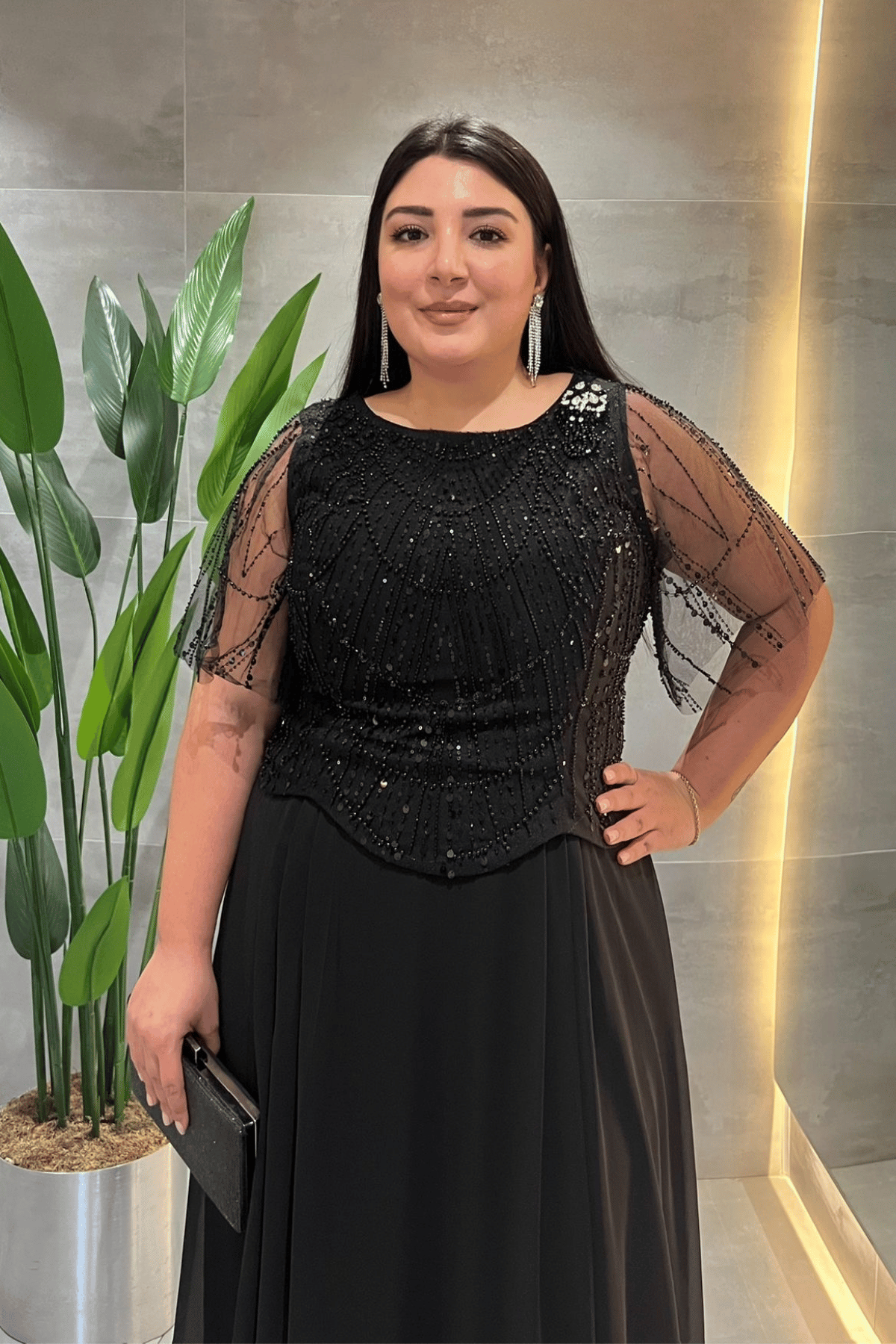 Üst Boncuklu Kumaş Alt Şifon Elbise - SİYAH