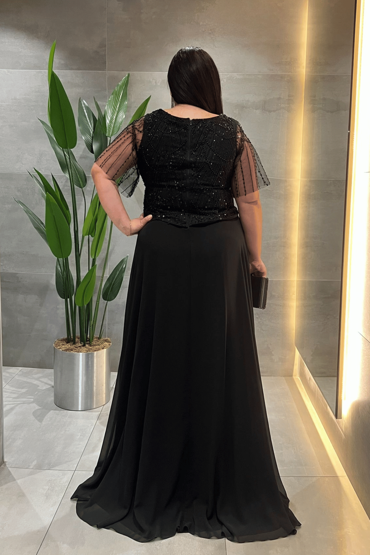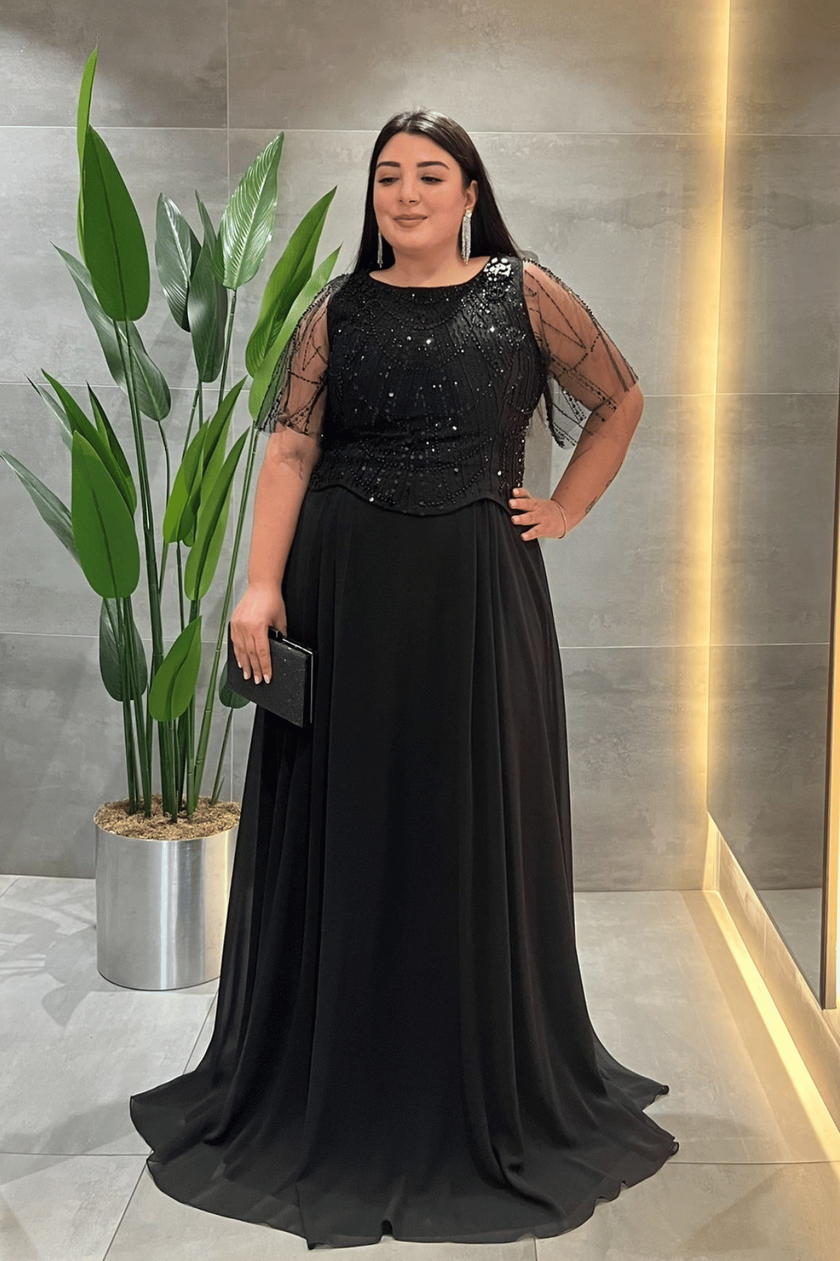 Üst Boncuklu Kumaş Alt Şifon Elbise - SİYAH (GYM-41127-SİYAH)