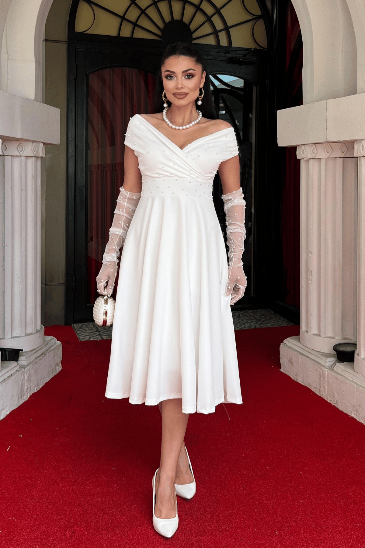 Krep Kumaş Kayık Yaka İnci Detaylı Abiye Elbise - BEYAZ (GYM-0946-BEYAZ)