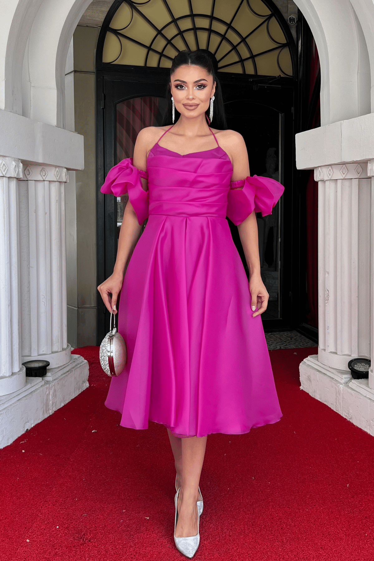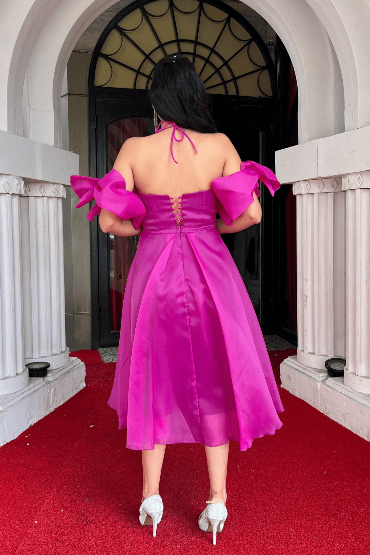 Organze Tül Kumaş Sırt Detaylı Midi Elbise - FUŞYA