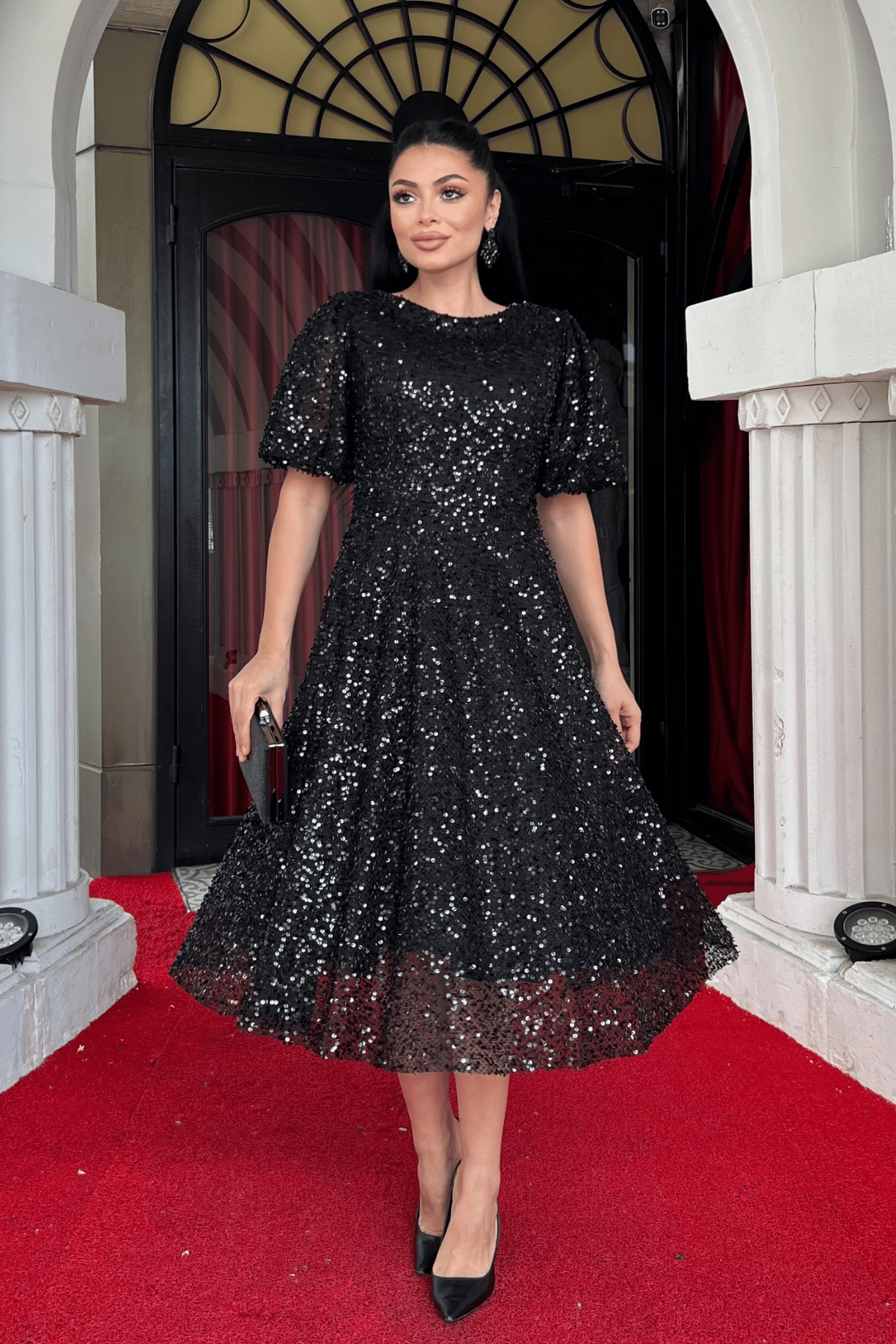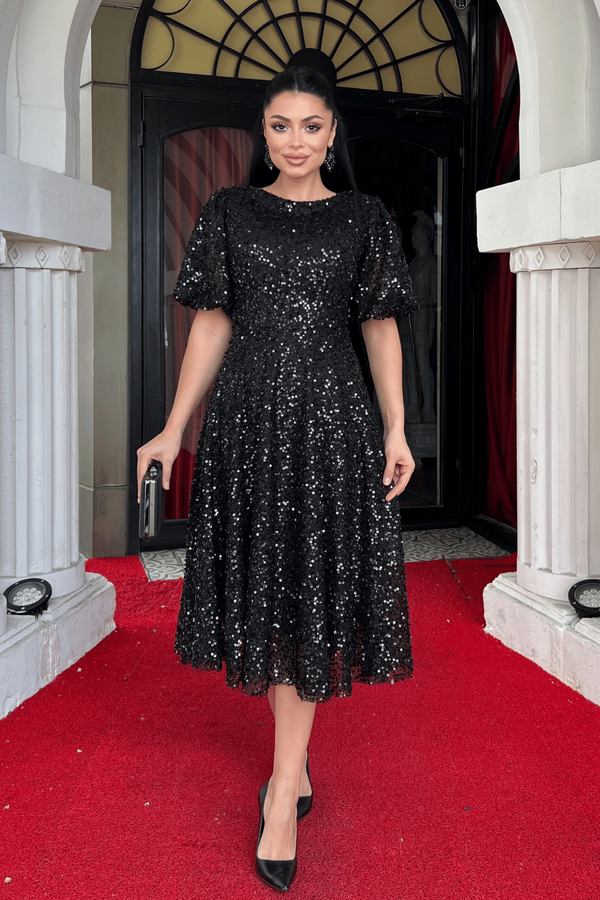 Pul Payet Kumaş Midi Boy Elbise - SİYAH