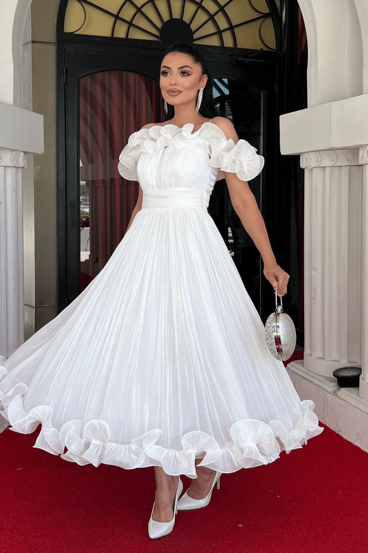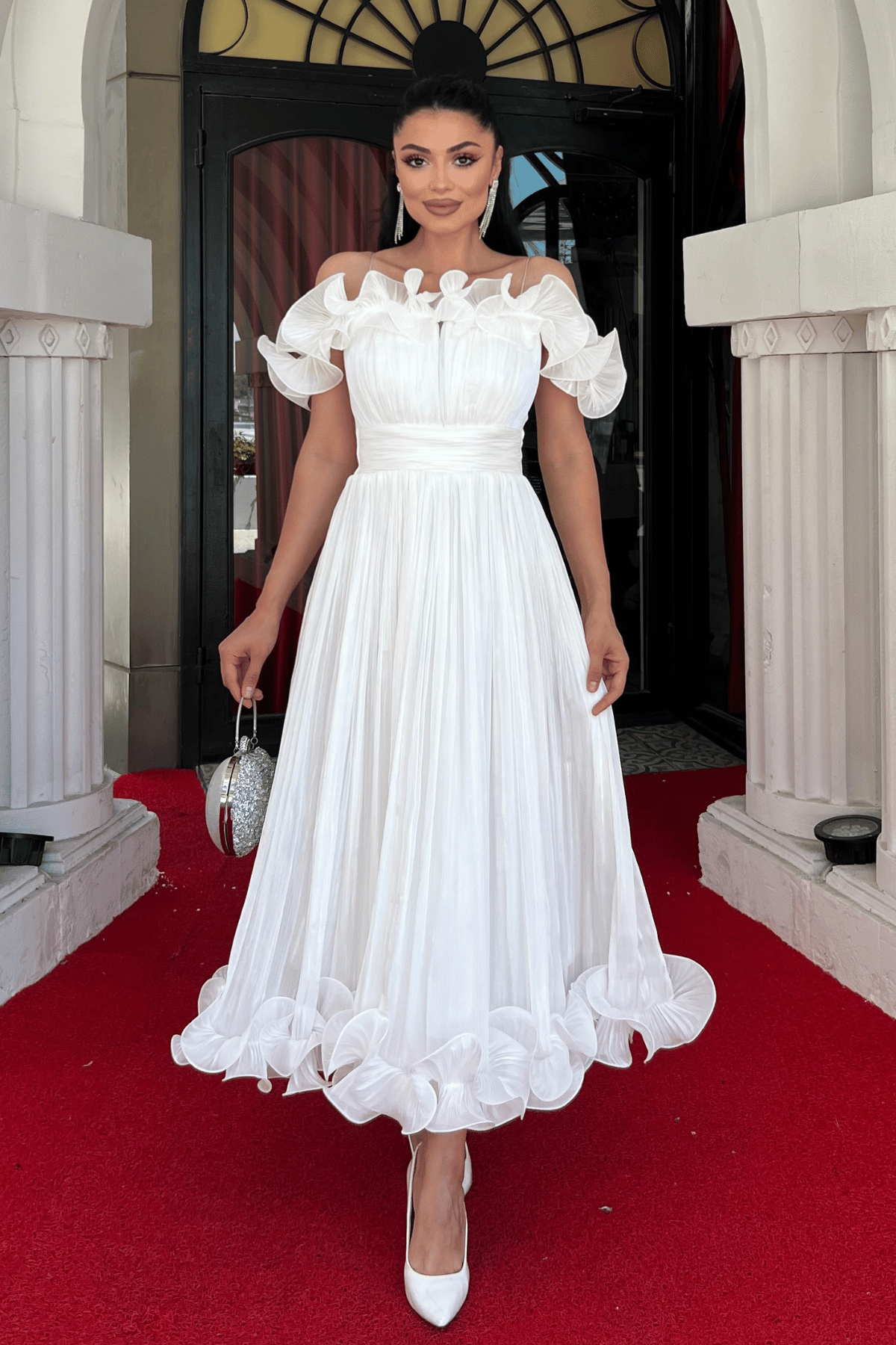 Şifon Kumaş Volan Detaylı Midi Elbise - BEYAZ (GYM-139-BEYAZ)