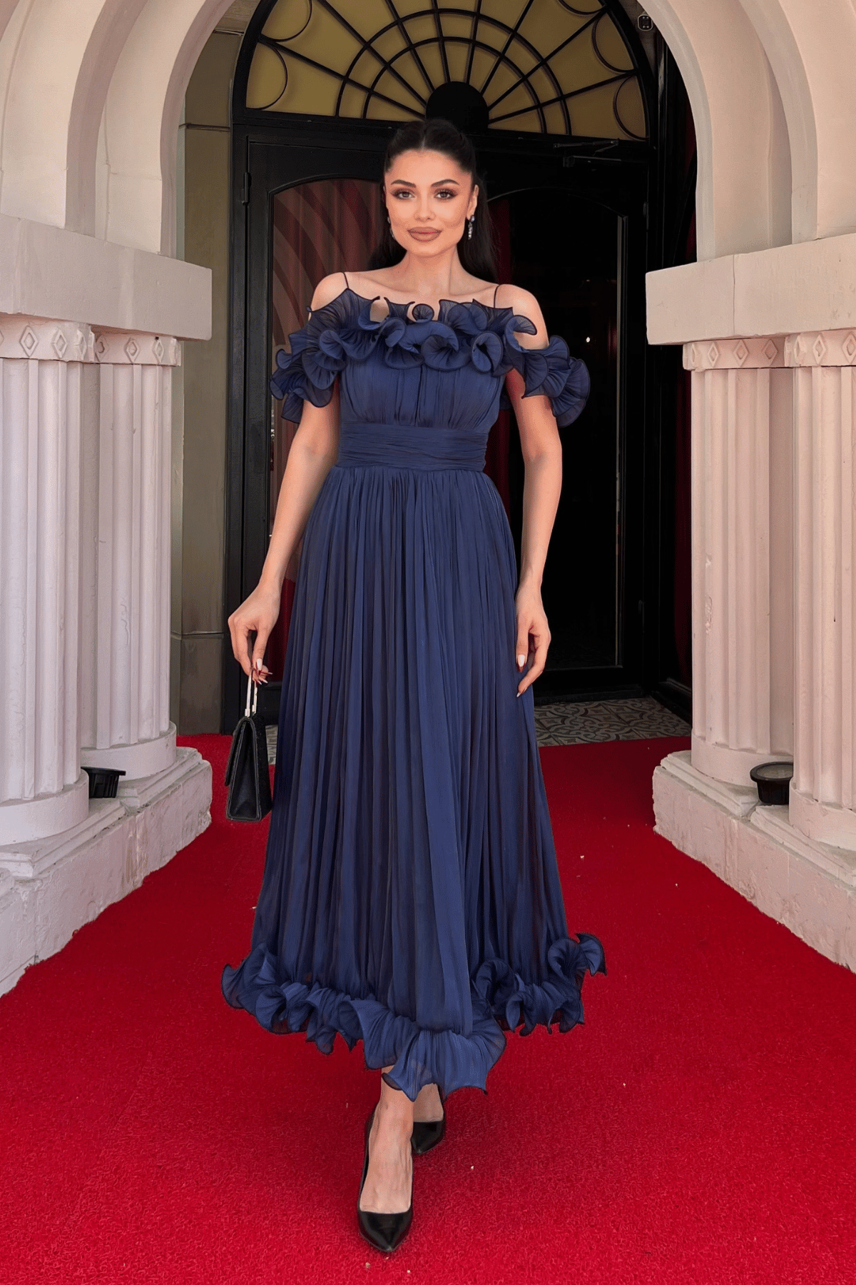 Şifon Kumaş Volan Detaylı Midi Elbise - LACİVERT (GYM-139-LACİVERT)
