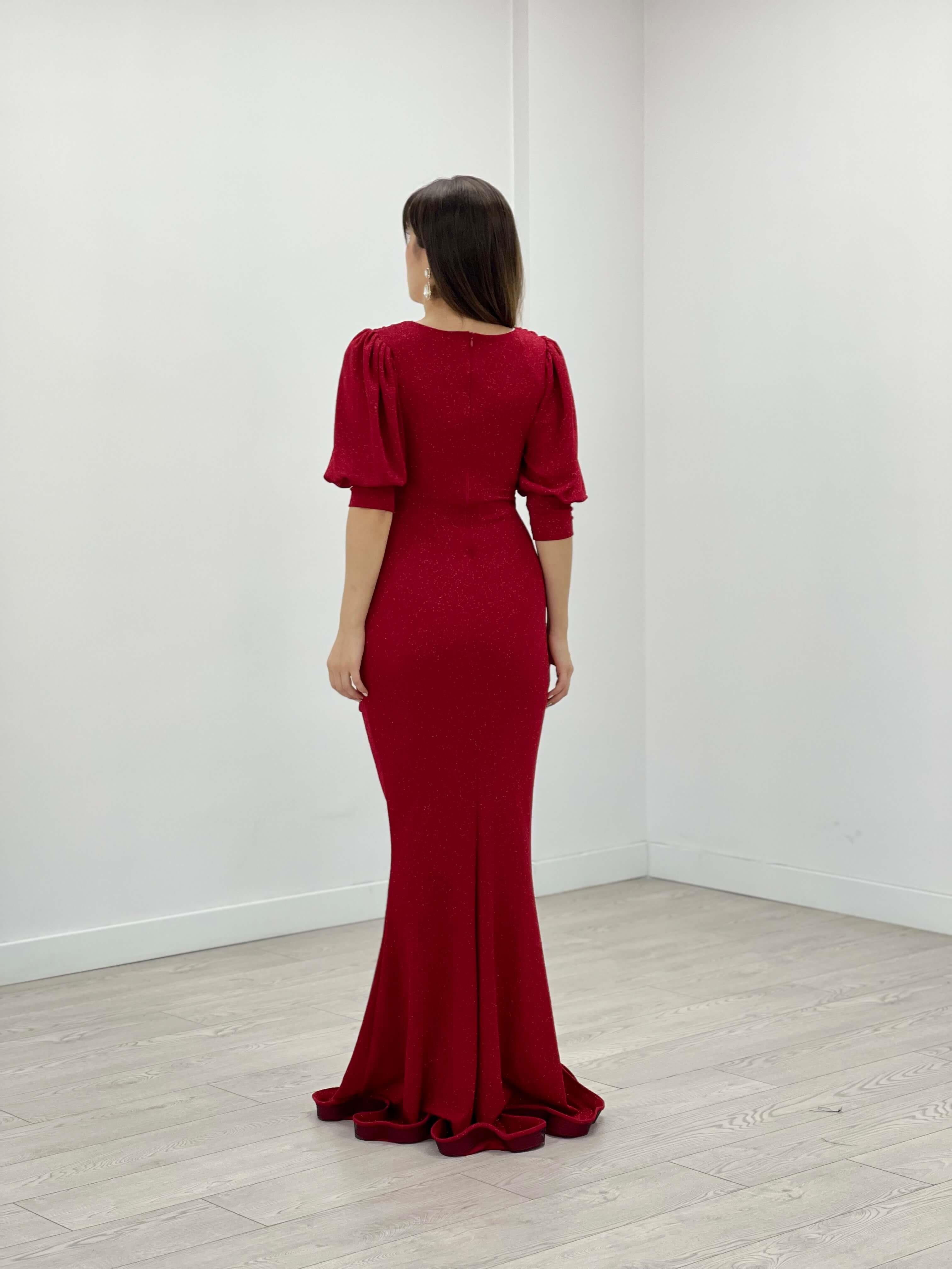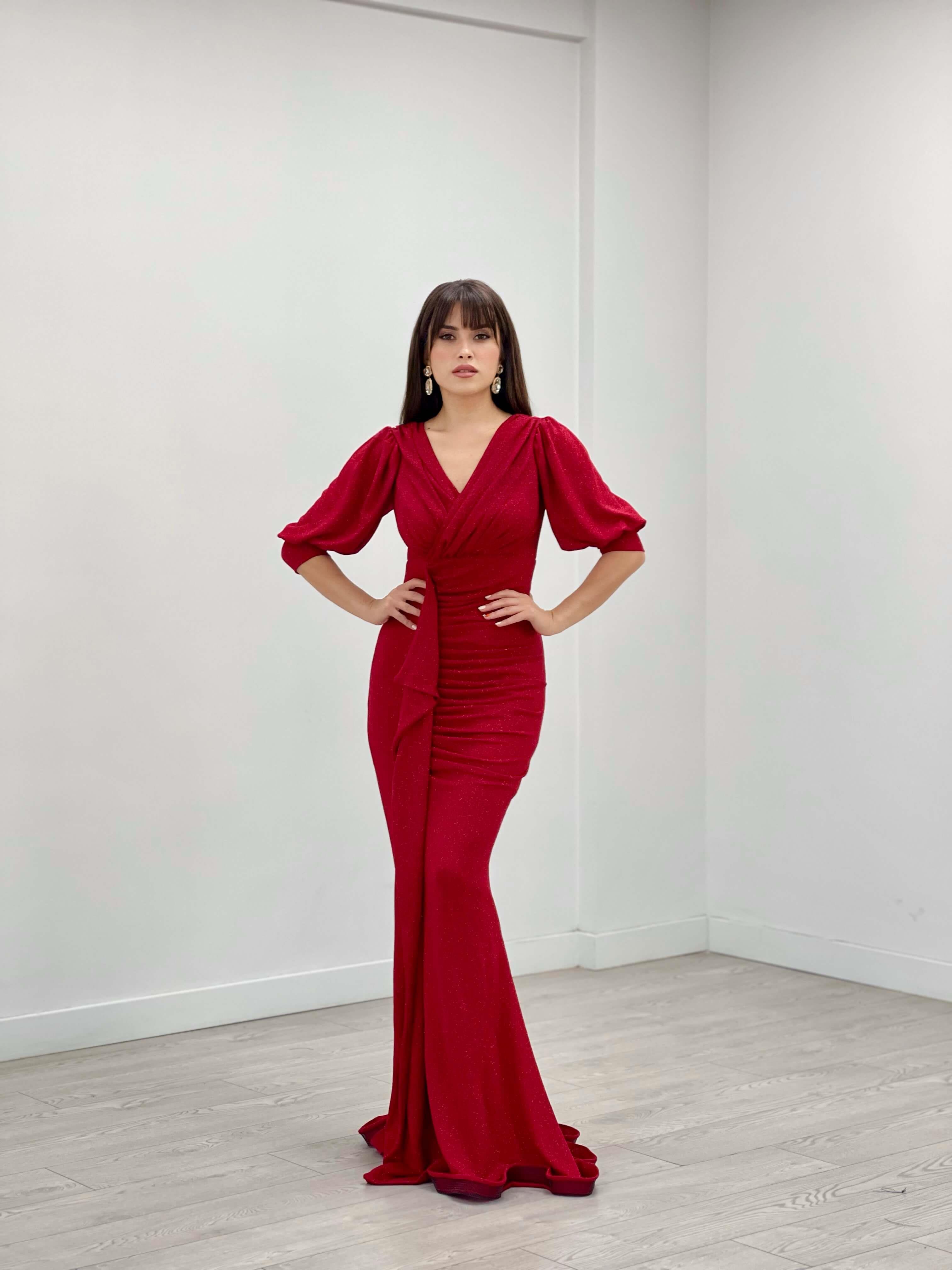 Simli Kumaş Balık Model Volan Detaylı Abiye Elbise - KIRMIZI (GYM-39491-KIRMIZI)