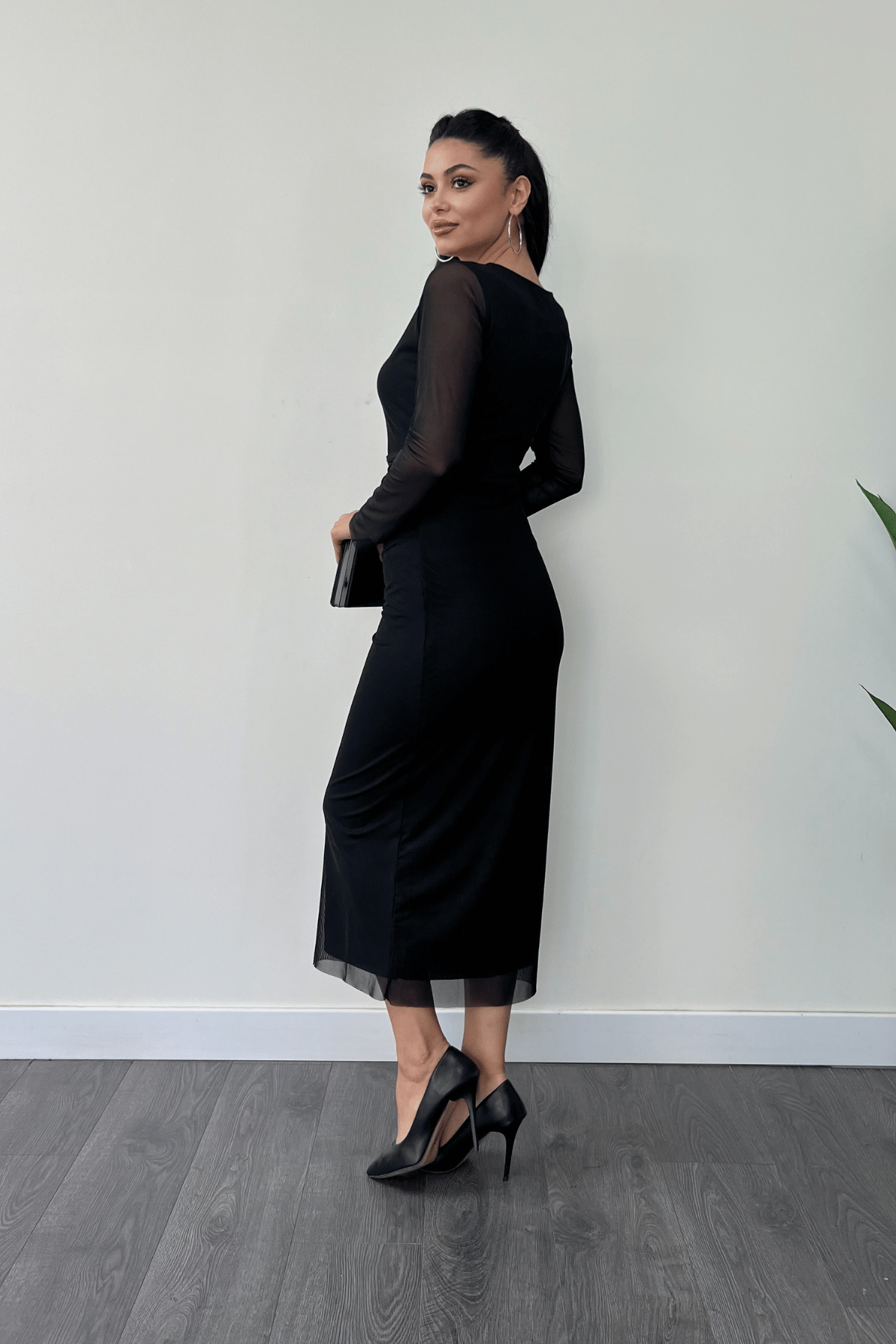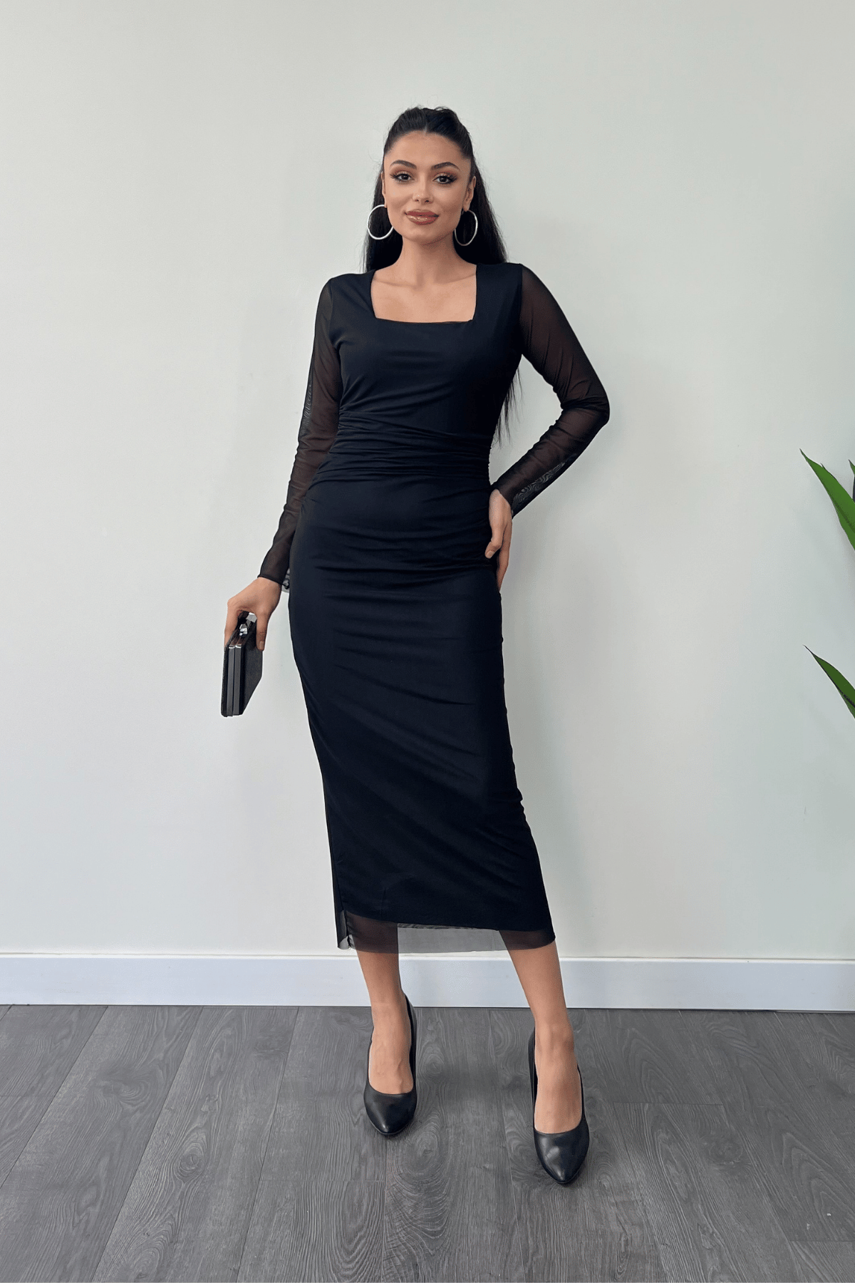 Tül Kumaş Büzgü Detaylı Kalem Elbise - SİYAH