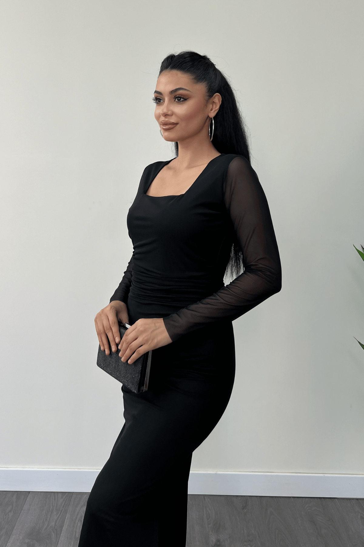 Tül Kumaş Büzgü Detaylı Kalem Elbise - SİYAH (GYM-5416-SİYAH)